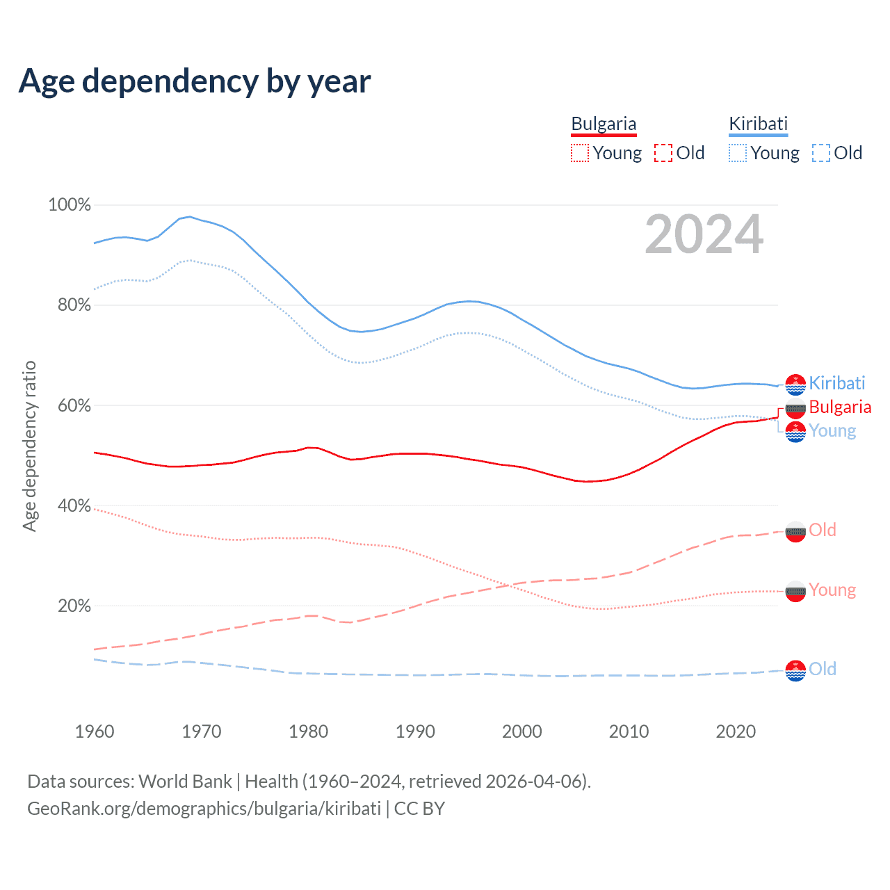 - The share of old-age demographic (65+) in Bulgaria is 22% vs 4.24% in Kiribati.