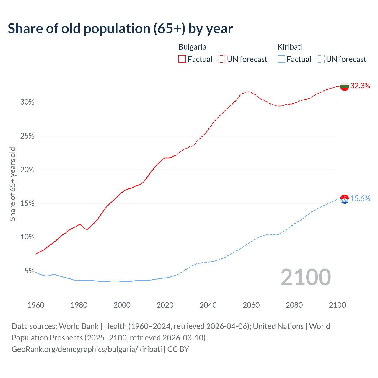 The share of older people aged 65 and over is 22% in Bulgaria and 4.24% in Kiribati. Life expectancy in Bulgaria compared to Kiribati .