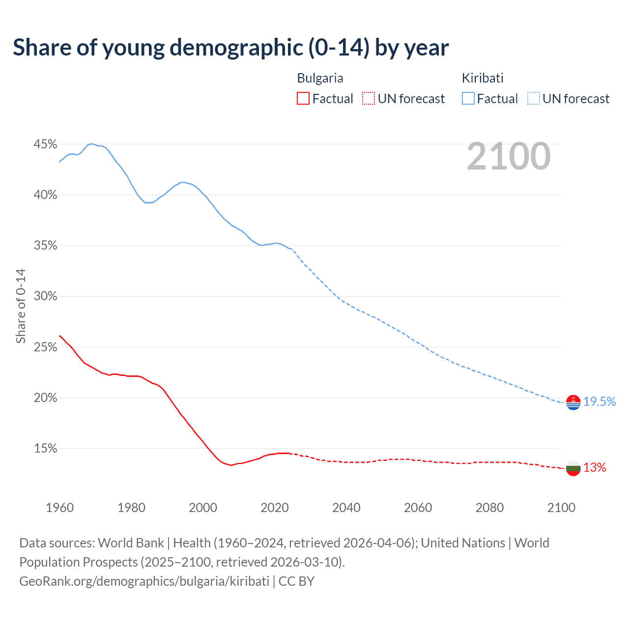 - The share of young demographic (0-15 years old) in Bulgaria is 14.5% vs 34.7% in Kiribati.