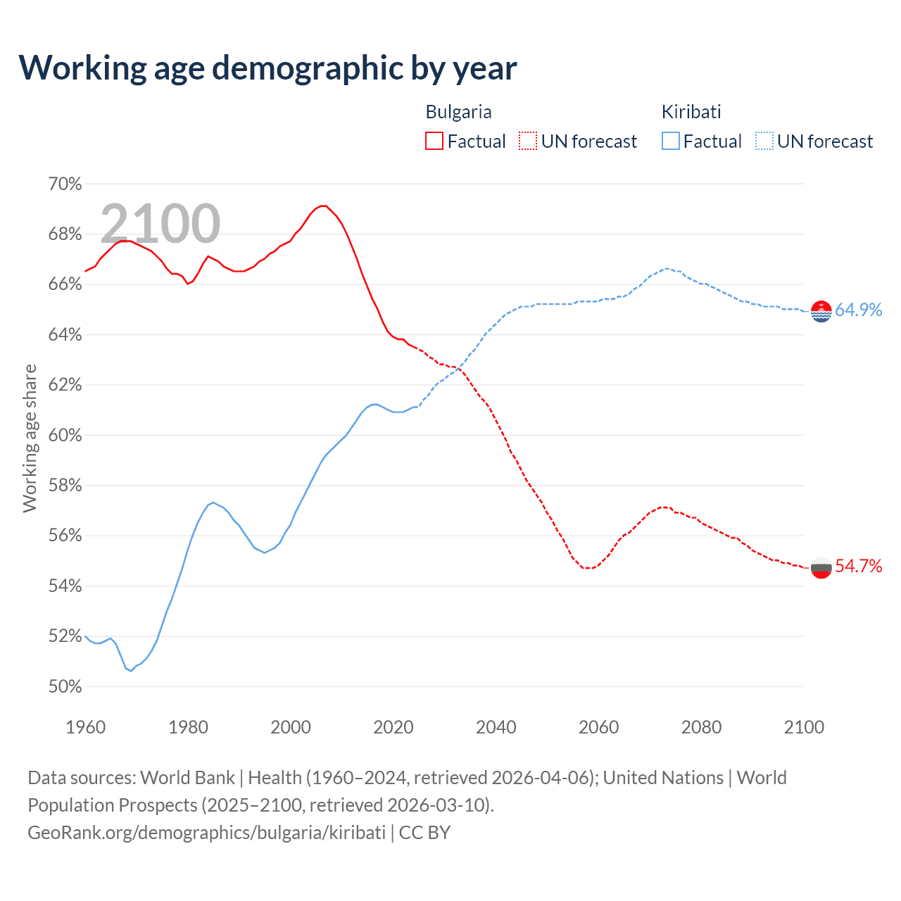 Median age Bulgaria vs Kiribati, 1960-2100