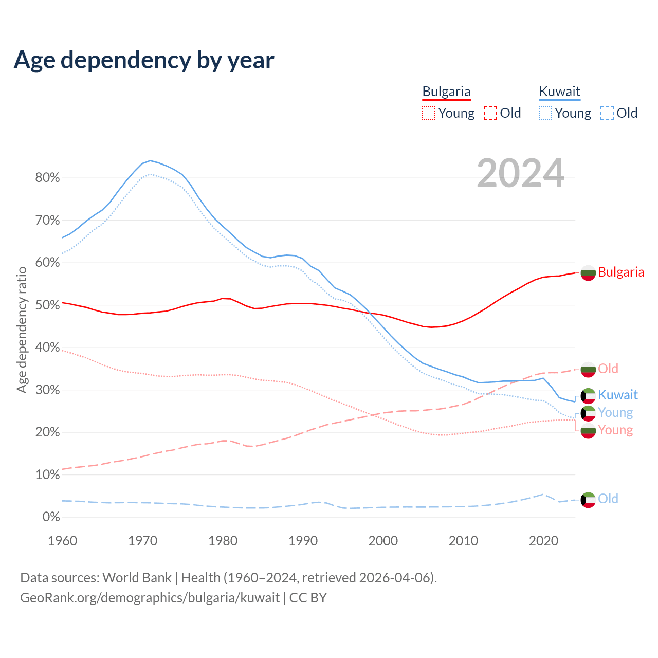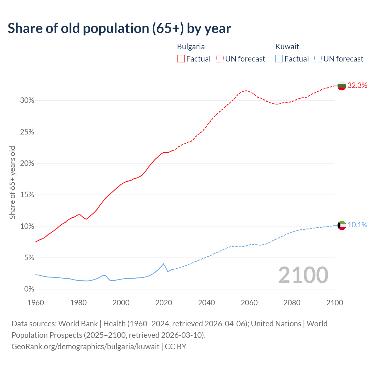 The share of older people aged 65 and over is 22% in Bulgaria and 3.1% in Kuwait. Life expectancy in Bulgaria compared to Kuwait .