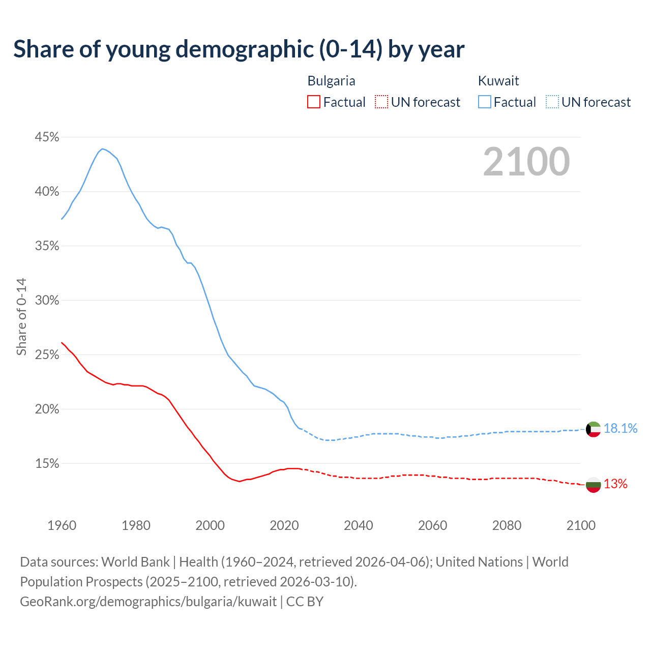 - The share of young demographic (0-15 years old) in Bulgaria is 14.5% vs 18.2% in Kuwait.