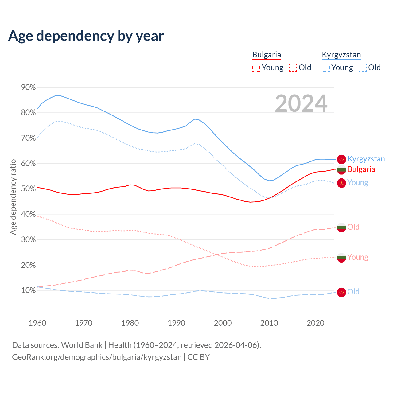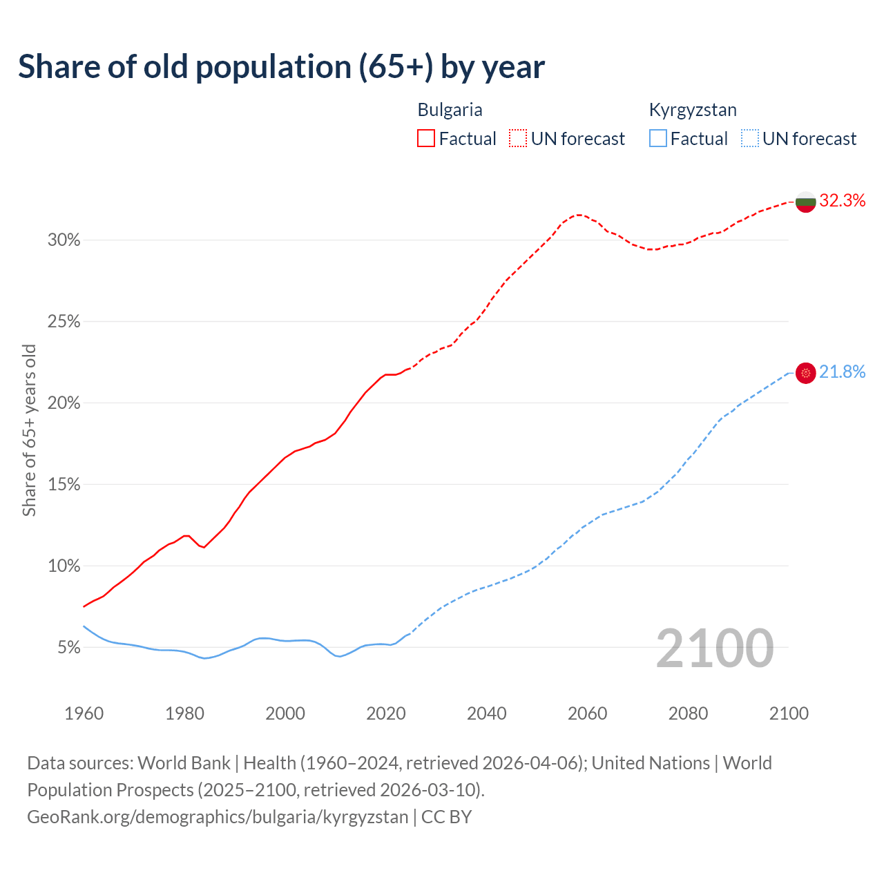 - The share of old-age demographic (65+) in Bulgaria is 22% vs 5.68% in Kyrgyzstan.