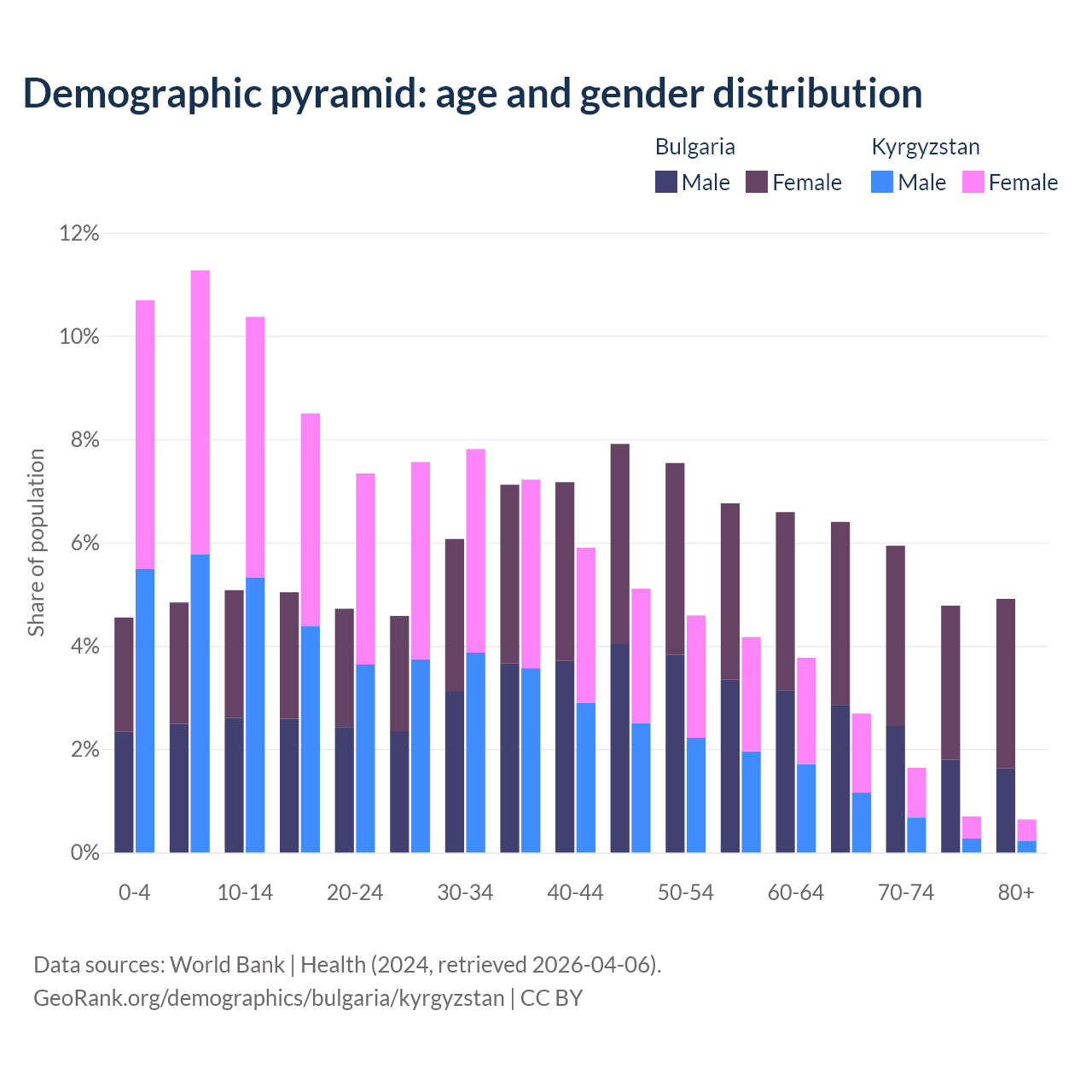 - As of 2026, the population of Bulgaria is 6.36M vs 7.47M in Kyrgyzstan.