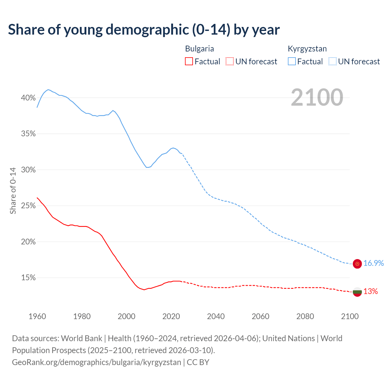 - The share of young demographic (0-15 years old) in Bulgaria is 14.5% vs 32.3% in Kyrgyzstan.