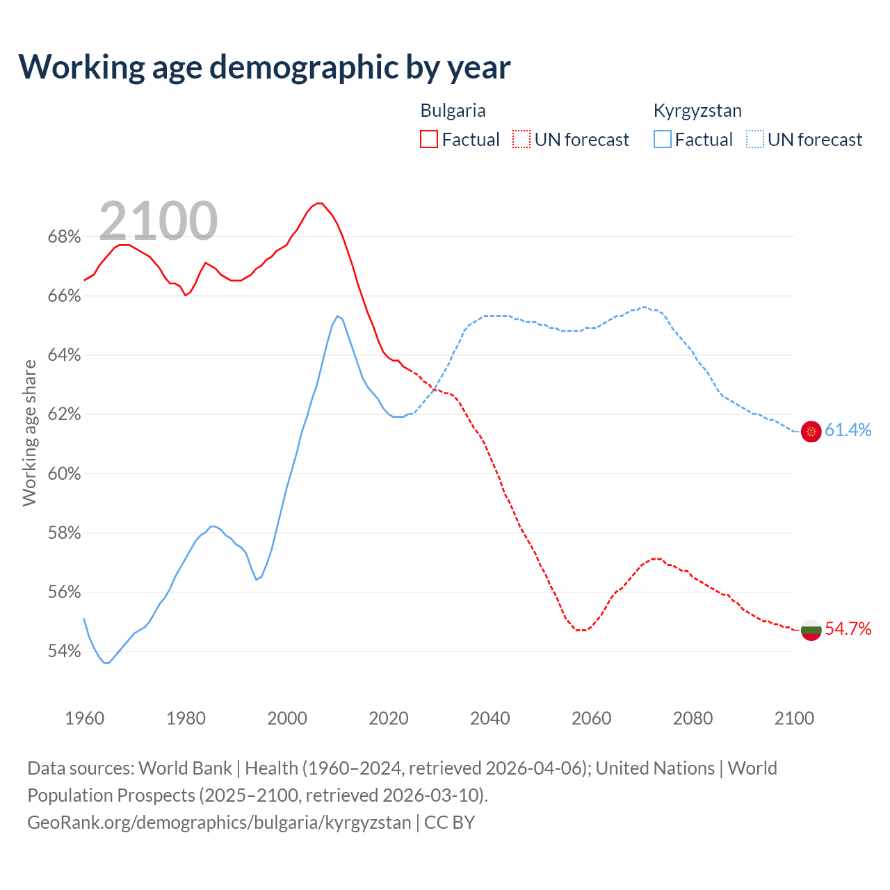 - Bulgaria has 4.04M working age adults (aged 15-64) vs 4.63M in Kyrgyzstan.