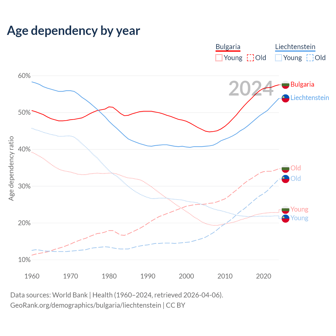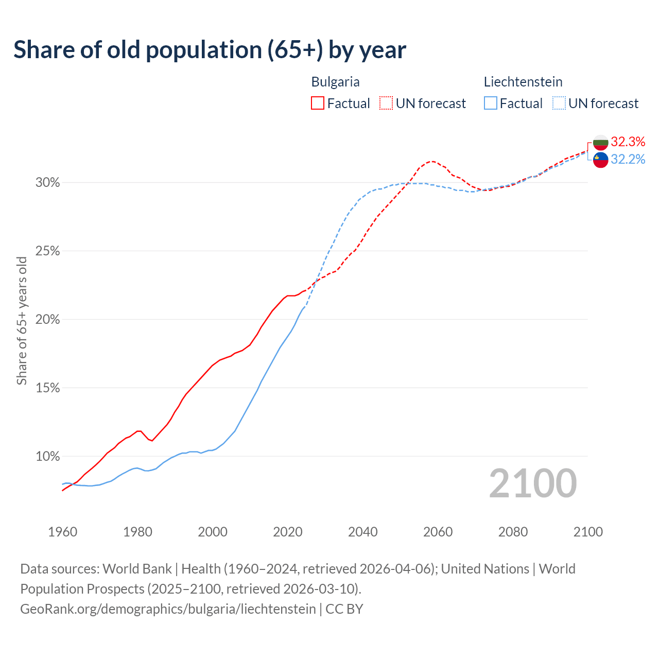 - The share of old-age demographic (65+) in Bulgaria is 22% vs 20.7% in Liechtenstein.