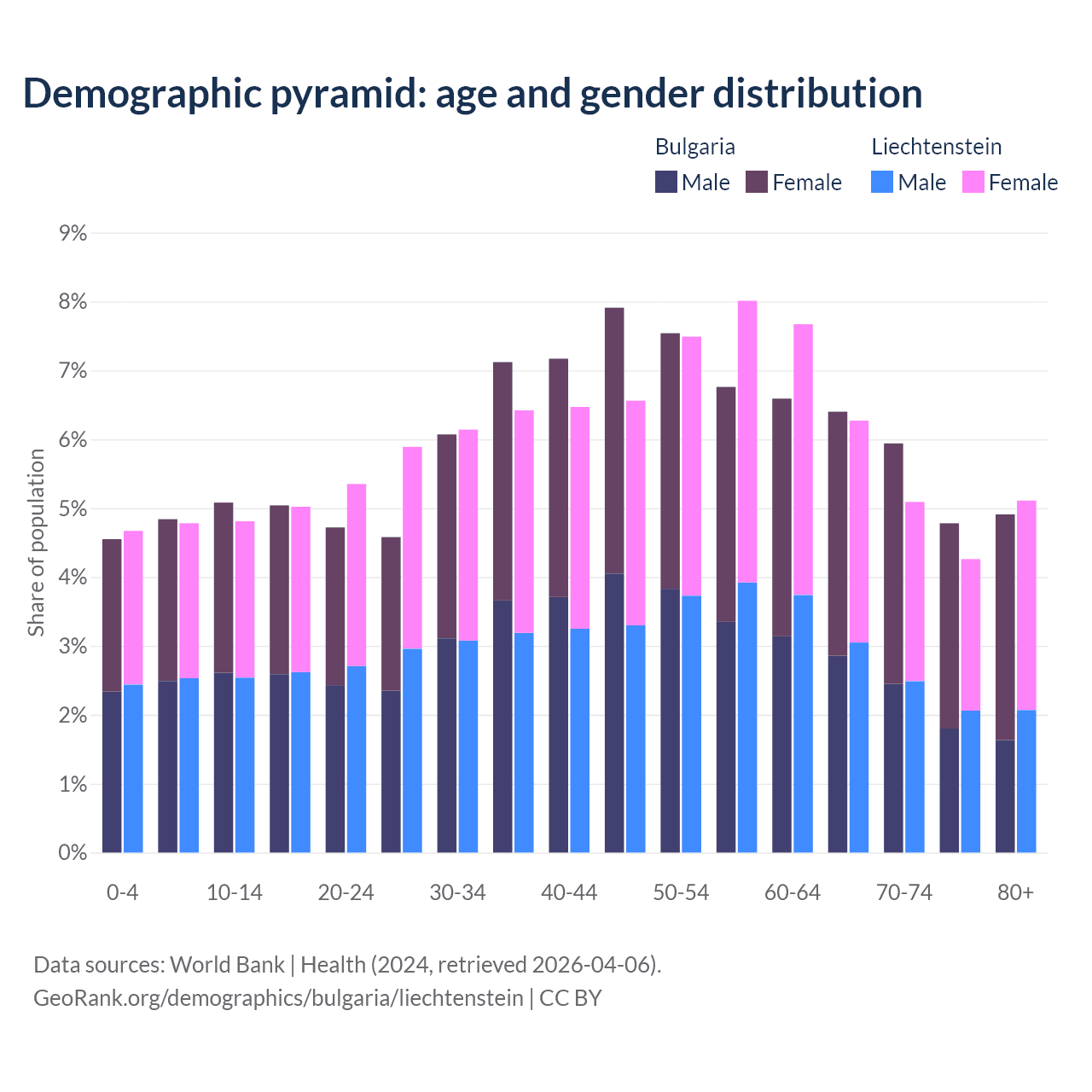 - Bulgaria is ranked 12/196 by median age (oldest to youngest) vs 13/196 for Liechtenstein.