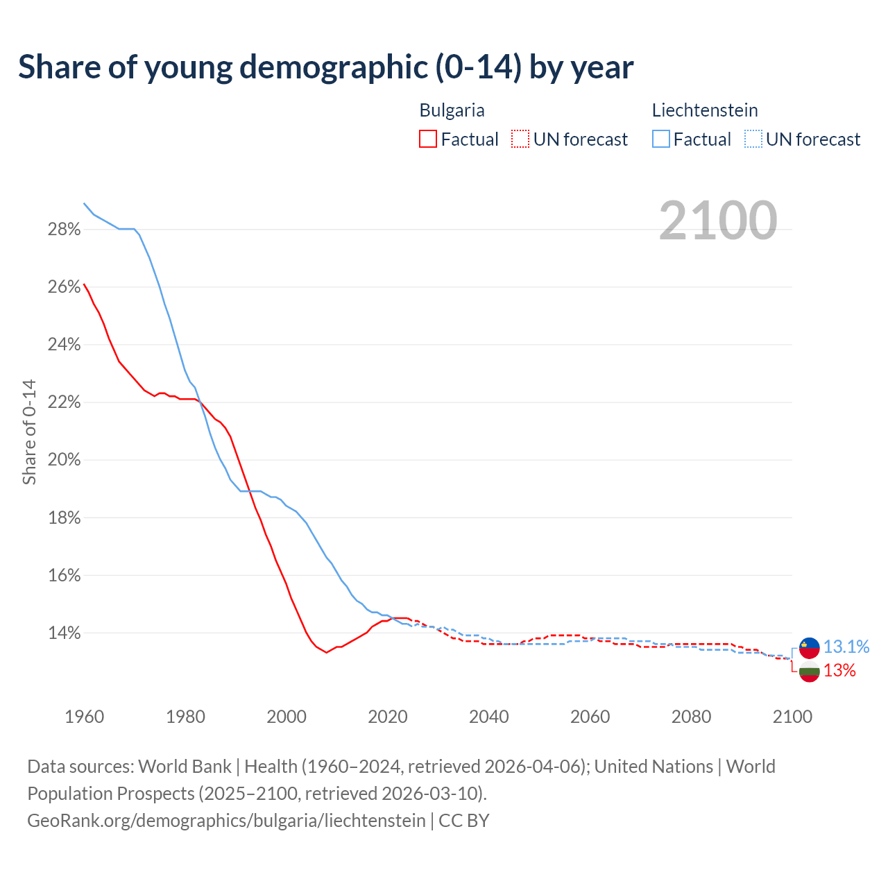 - The share of young demographic (0-15 years old) in Bulgaria is 14.5% vs 14.3% in Liechtenstein.