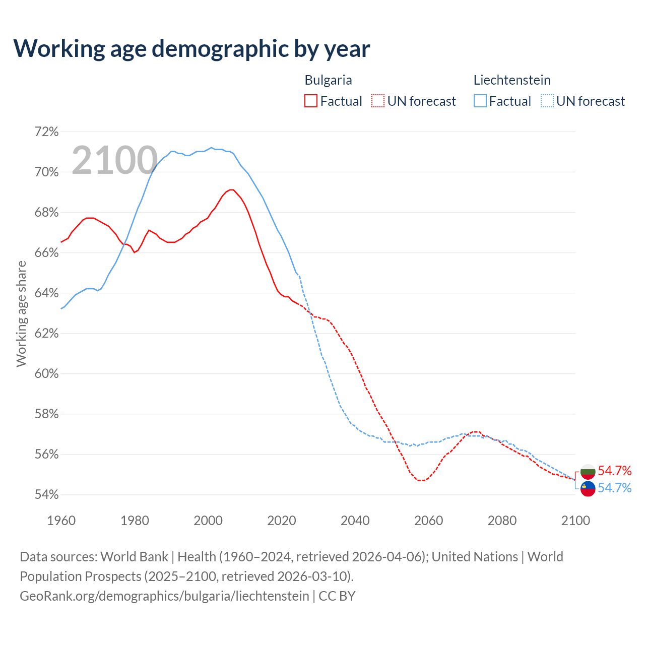 - Bulgaria has 4.04M working age adults (aged 15-64) vs 26.7K in Liechtenstein.