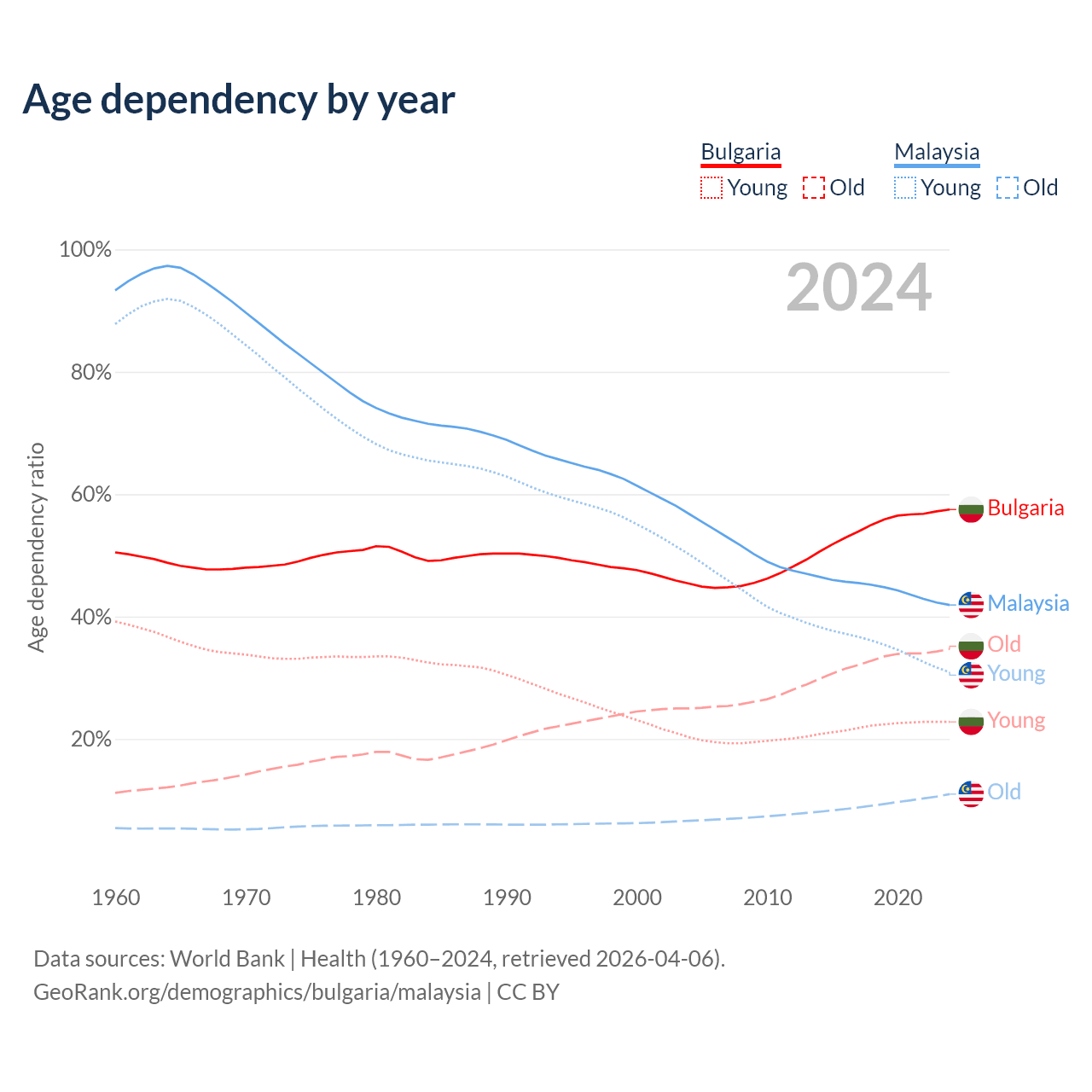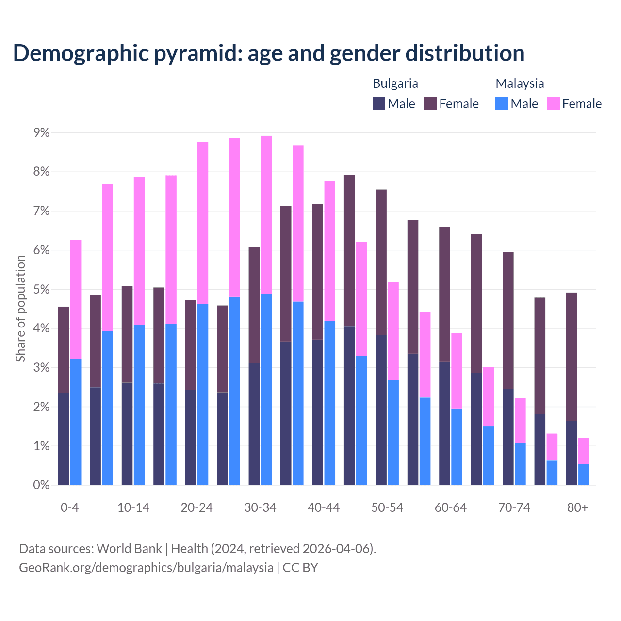 - Bulgaria is ranked 12/196 by median age (oldest to youngest) vs 92/196 for Malaysia.