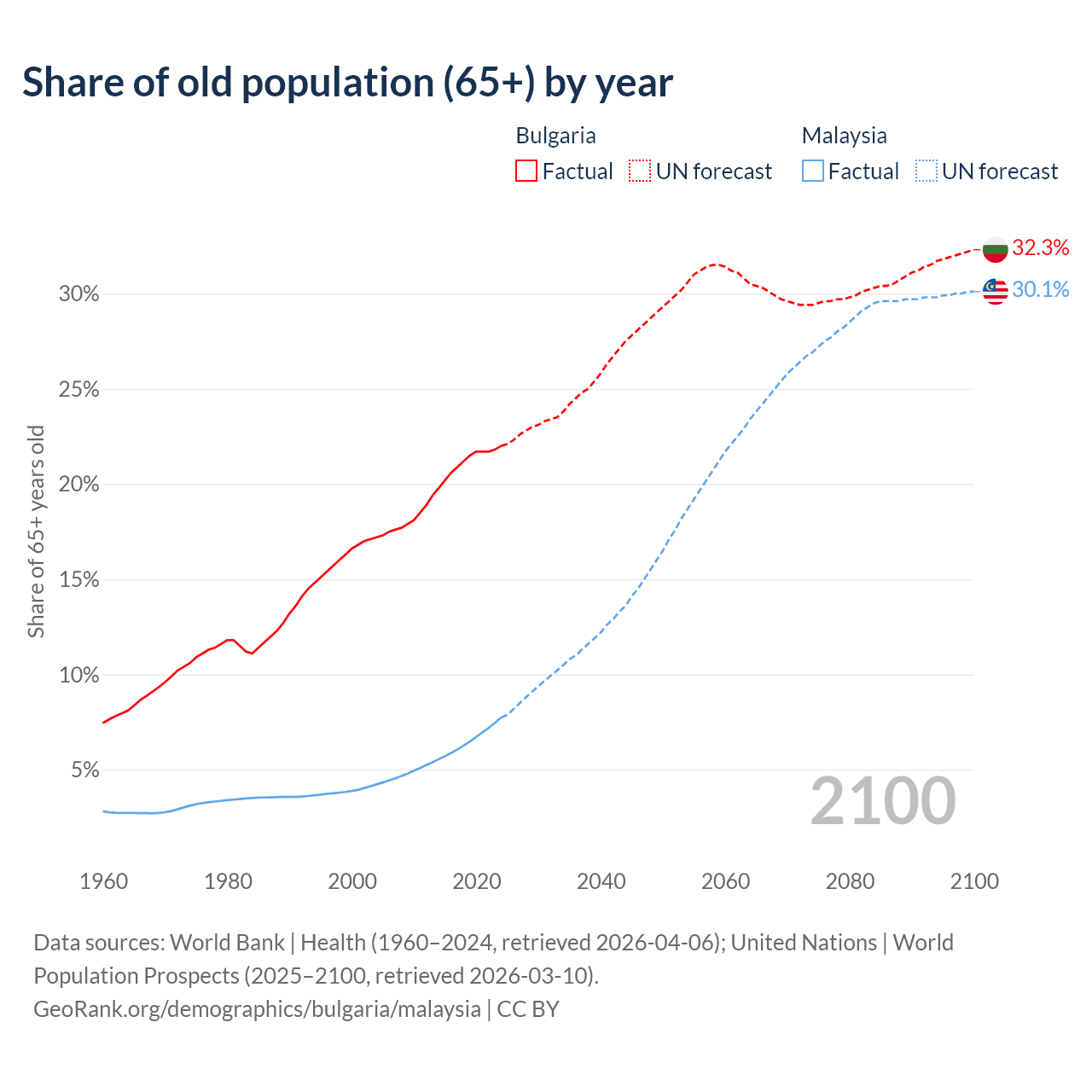 The share of older people aged 65 and over is 22% in Bulgaria and 7.74% in Malaysia. Life expectancy in Bulgaria compared to Malaysia .