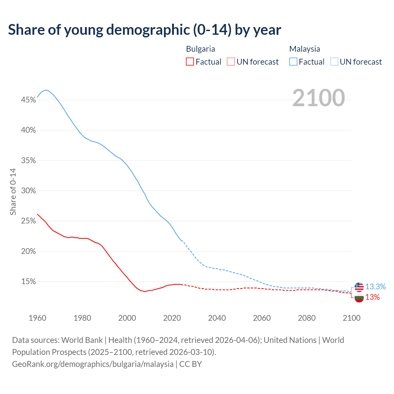 - The share of young demographic (0-15 years old) in Bulgaria is 14.5% vs 21.8% in Malaysia.