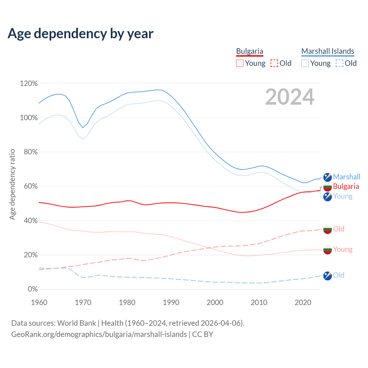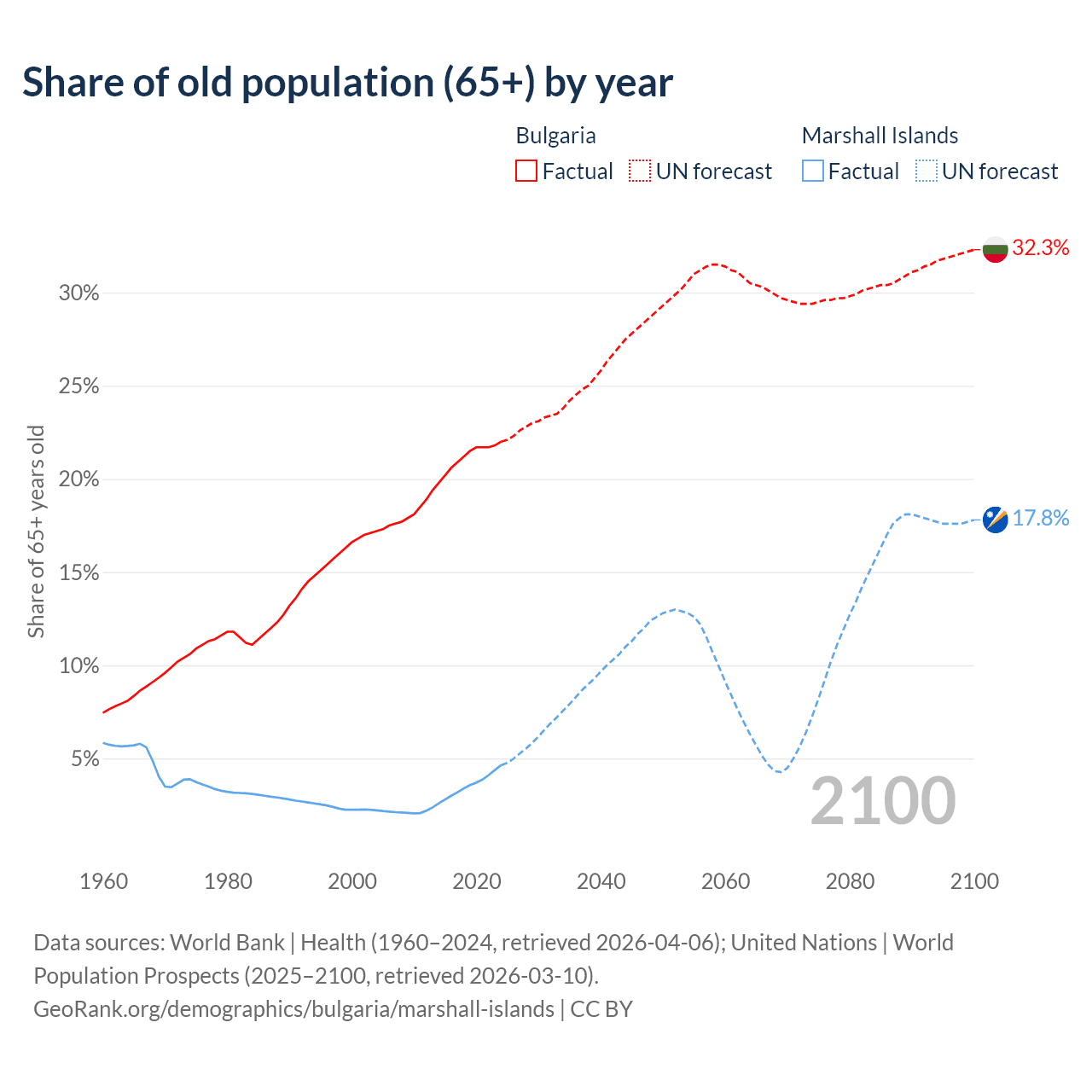 - The share of old-age demographic (65+) in Bulgaria is 22% vs 4.64% in the Marshall Islands.