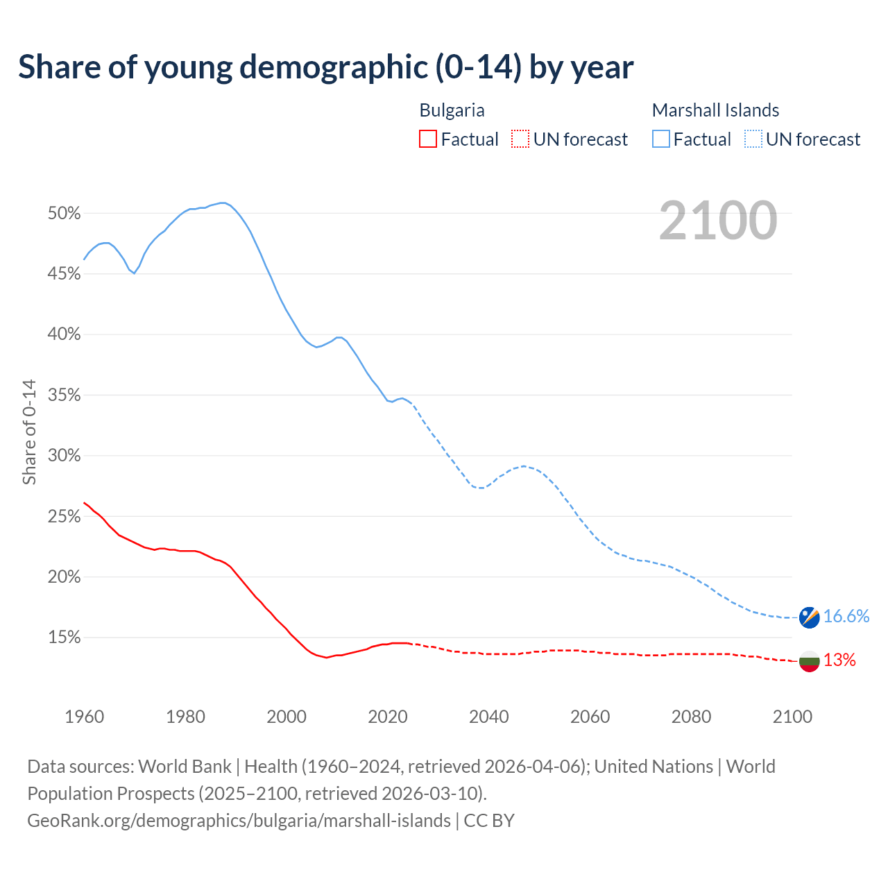 - The share of young demographic (0-15 years old) in Bulgaria is 14.5% vs 34.5% in the Marshall Islands.