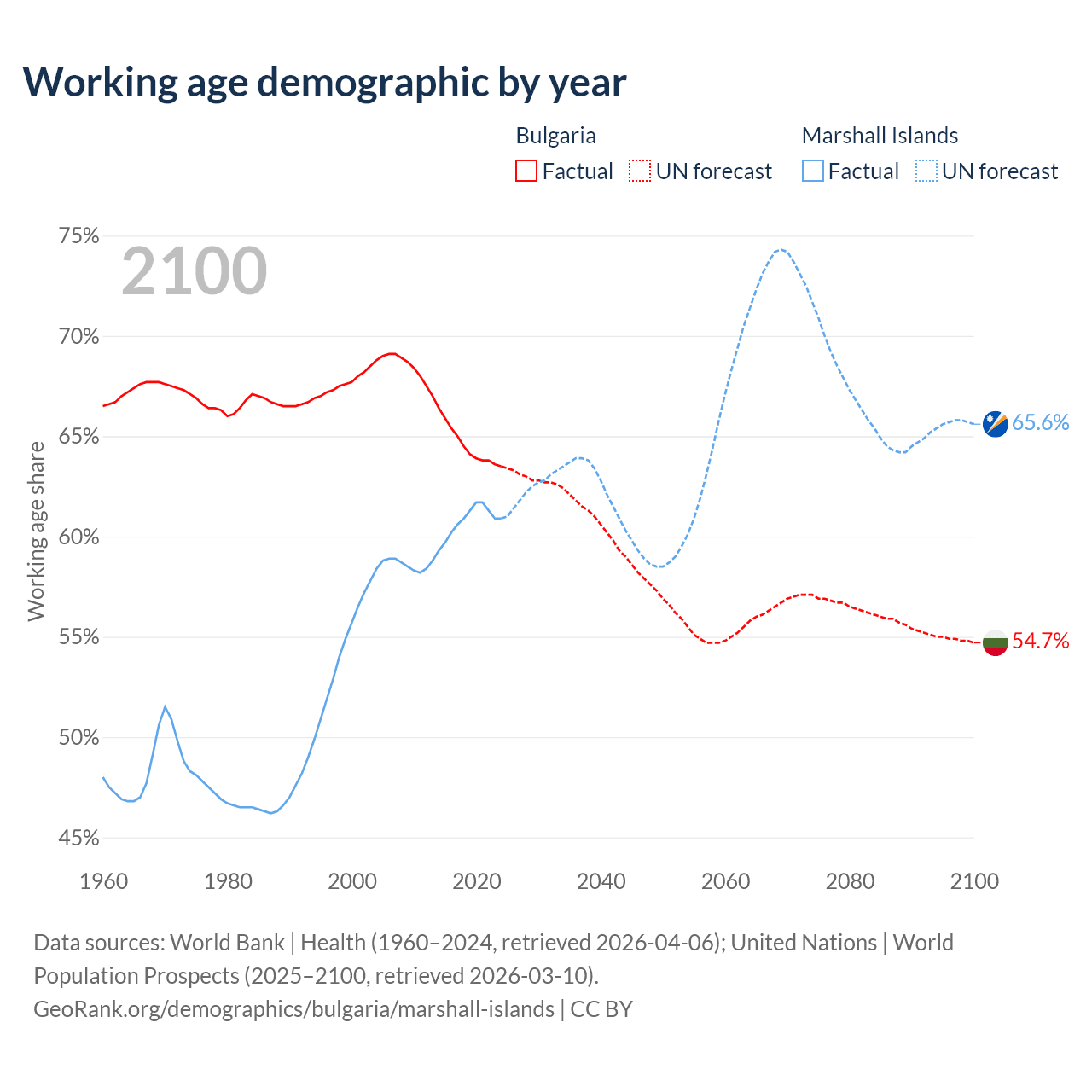 - Bulgaria has 4.04M working age adults (aged 15-64) vs 21.3K in the Marshall Islands.