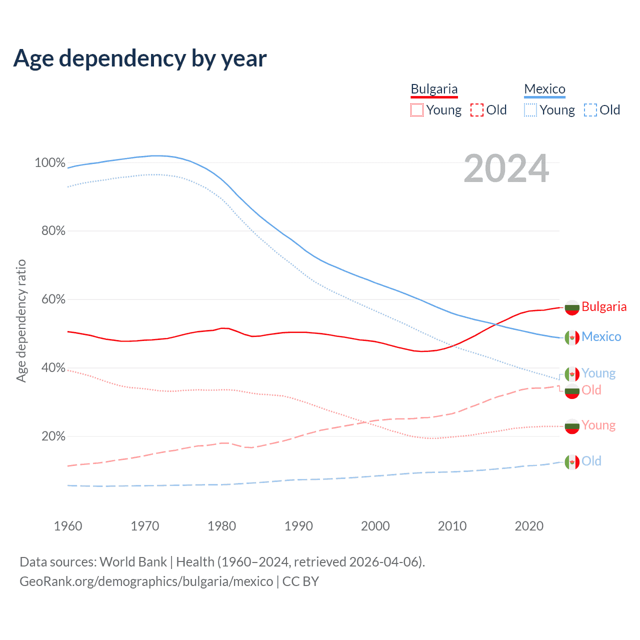 Data sources: World Bank | Health (1960–2024, retrieved 2026-04-06); U.S. Census Bureau (1960–2024, retrieved 2026-02-08).
