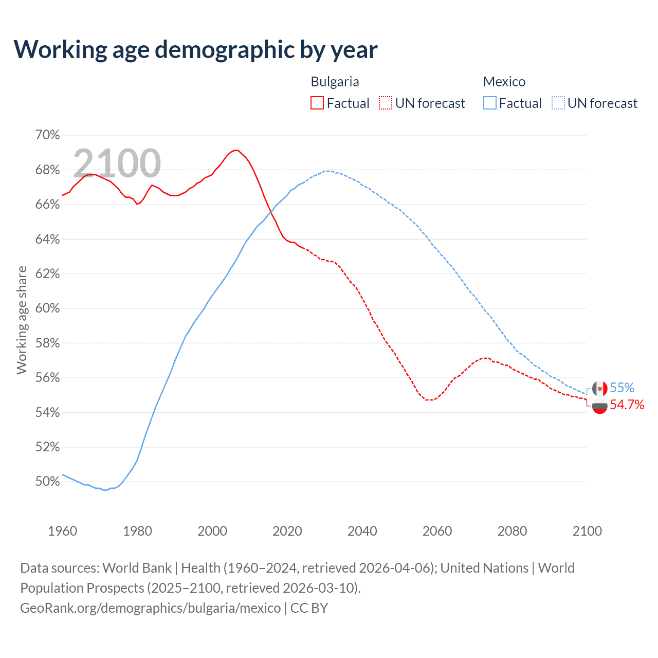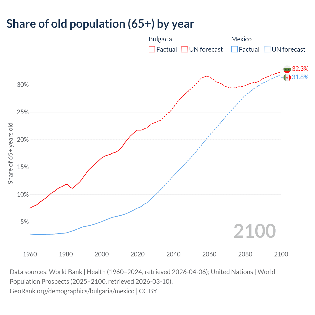 Median age Bulgaria vs Mexico, 1960-2100