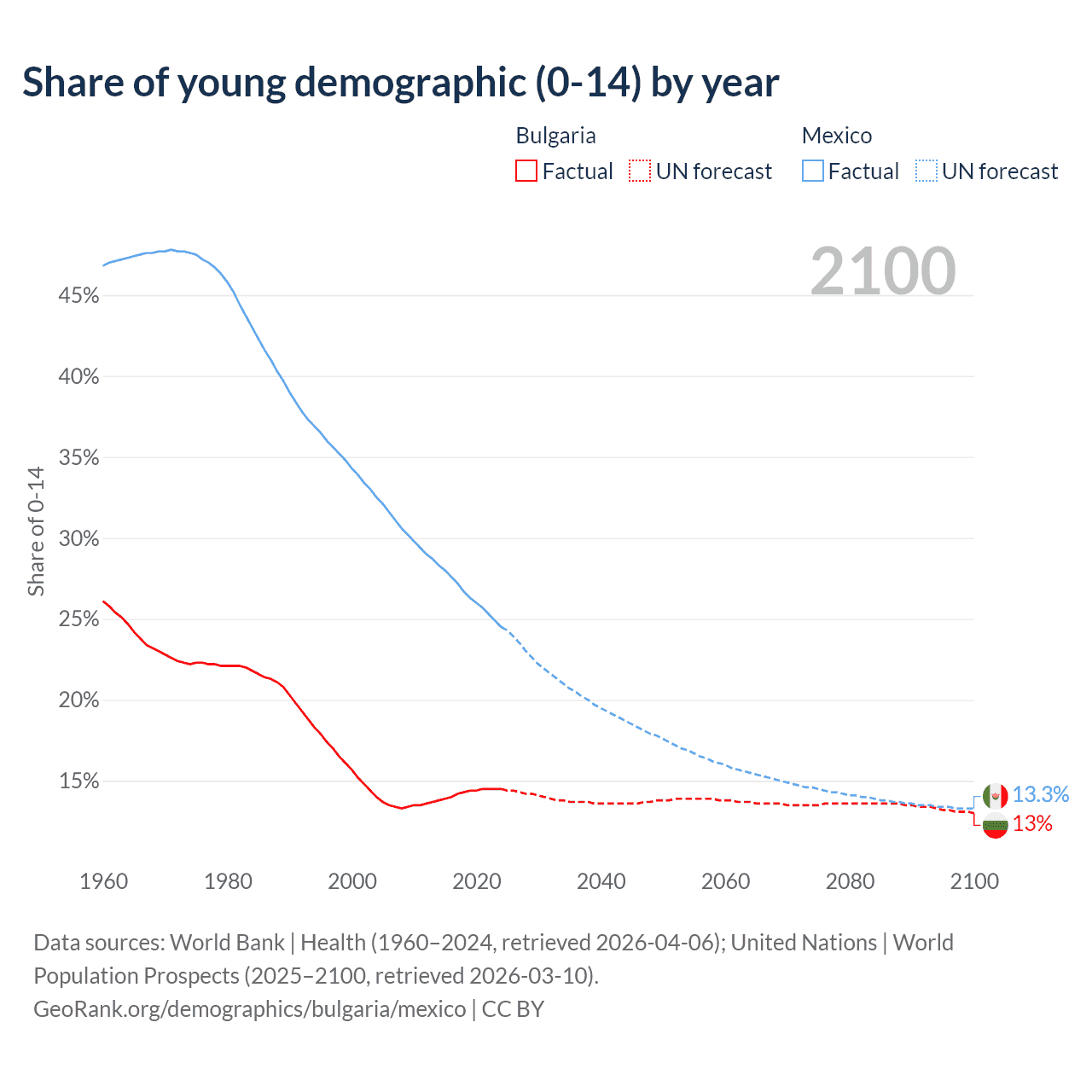 - The share of young demographic (0-15 years old) in Bulgaria is 14.5% vs 24.5% in Mexico.