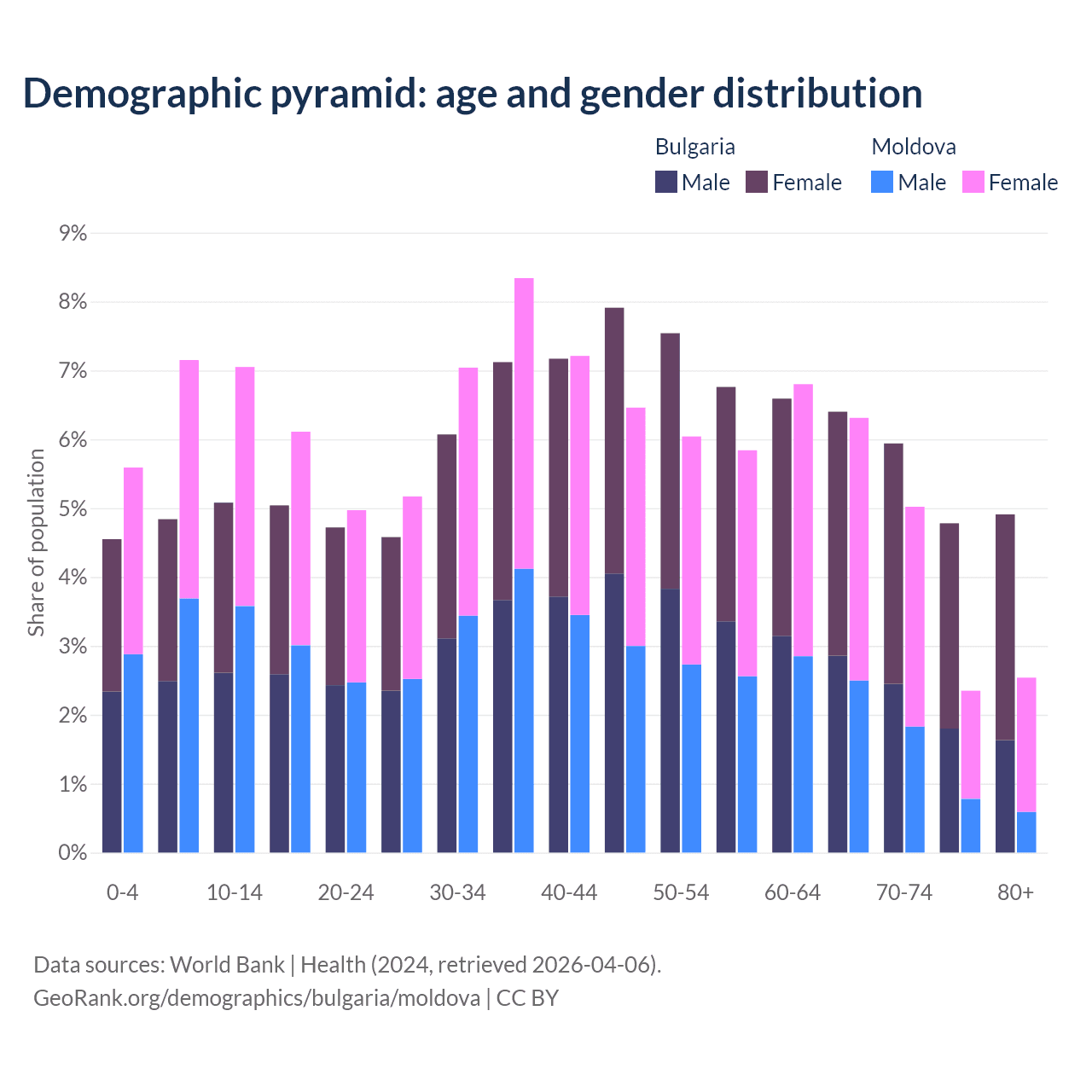 - Bulgaria is ranked 12/196 by median age (oldest to youngest) vs 54/196 for Moldova.