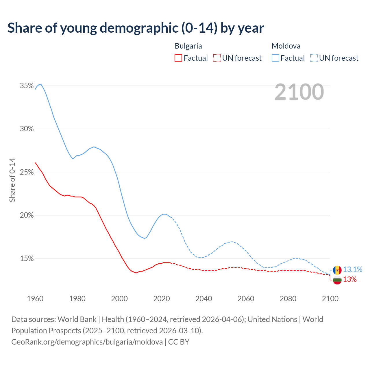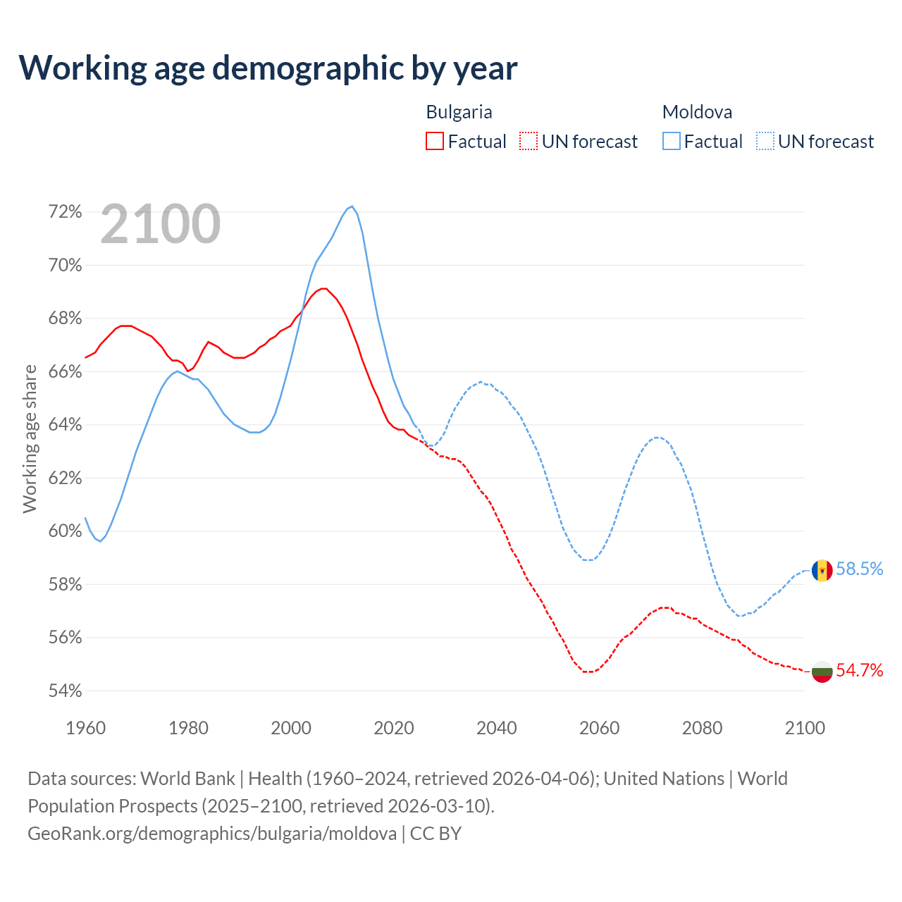 Median age Bulgaria vs Moldova, 1960-2100