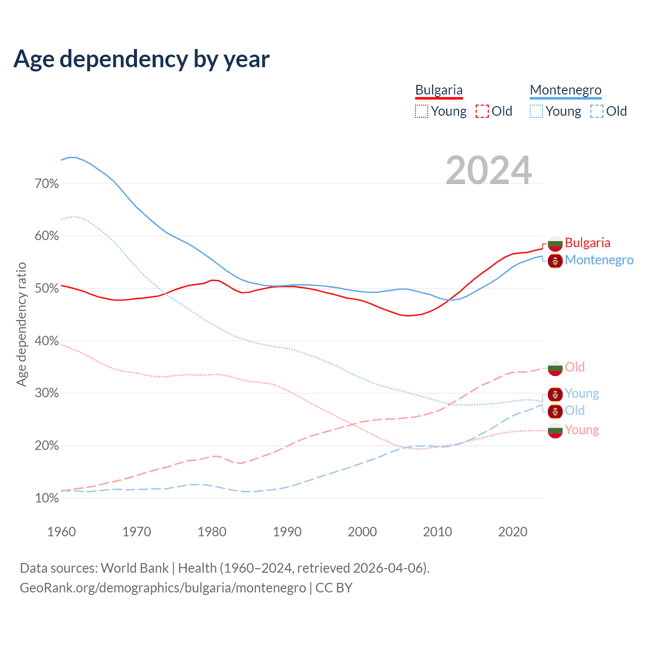 Data sources: World Bank | Health (1960–2024, retrieved 2026-04-06); U.S. Census Bureau (1960–2024, retrieved 2026-02-08).