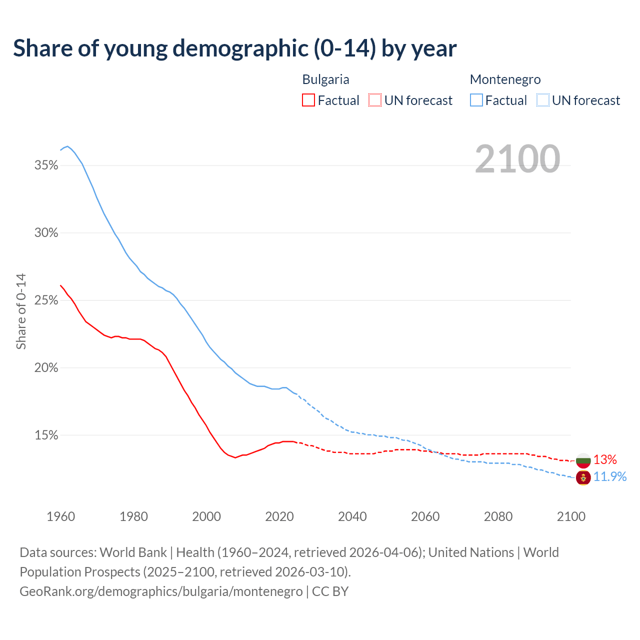 - The share of young demographic (0-15 years old) in Bulgaria is 14.5% vs 18.1% in Montenegro.