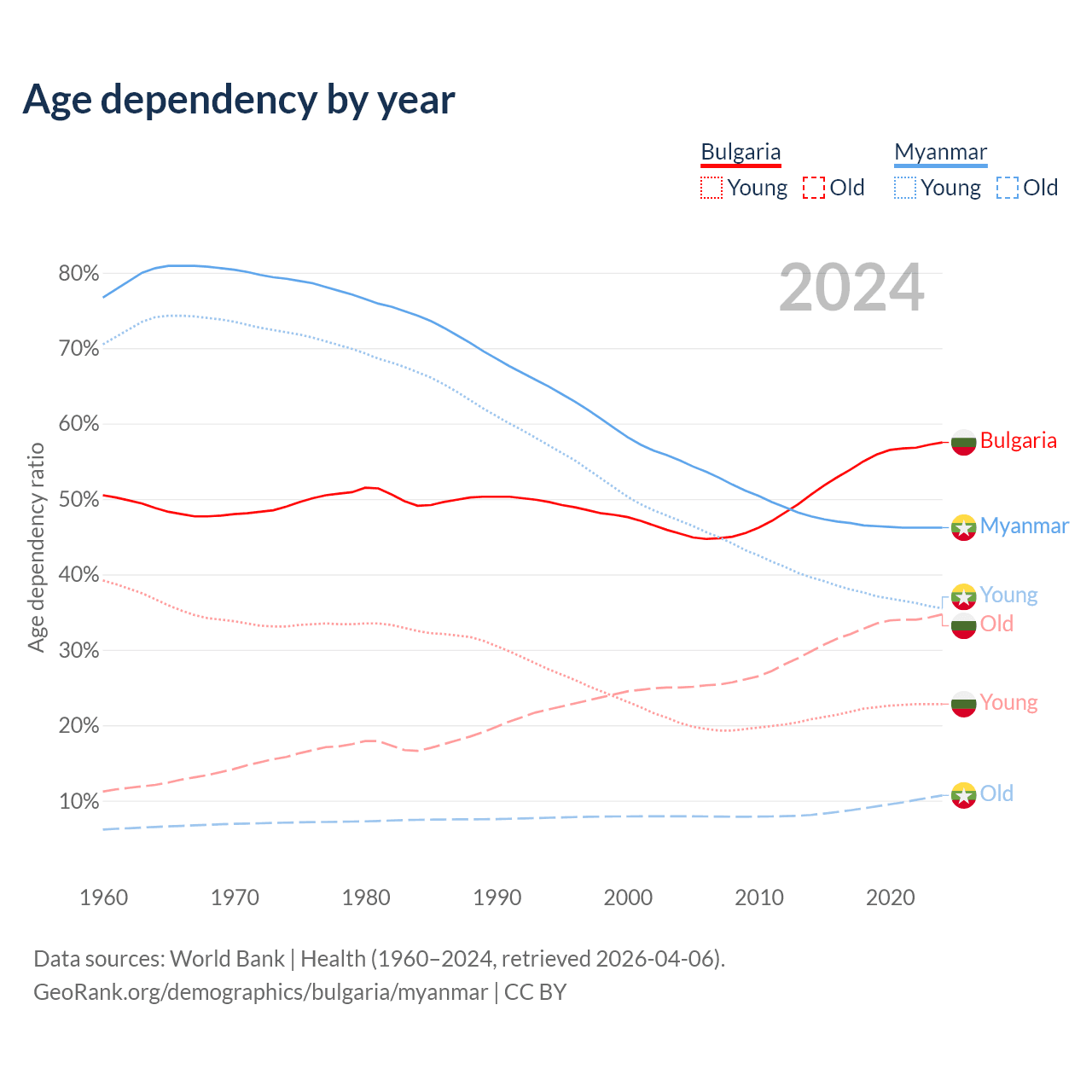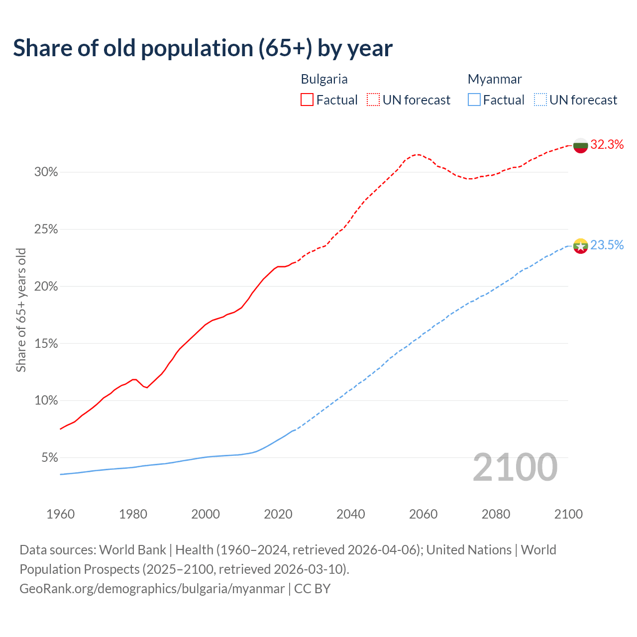 The share of older people aged 65 and over is 22% in Bulgaria and 7.3% in Myanmar. Life expectancy in Bulgaria compared to Myanmar .