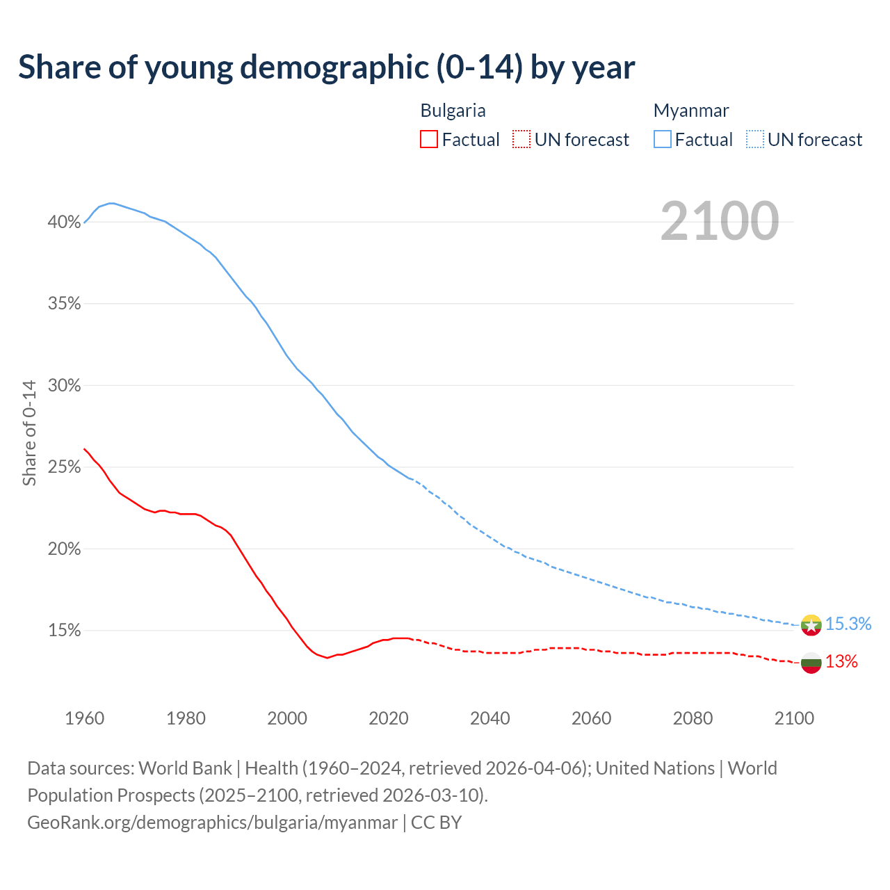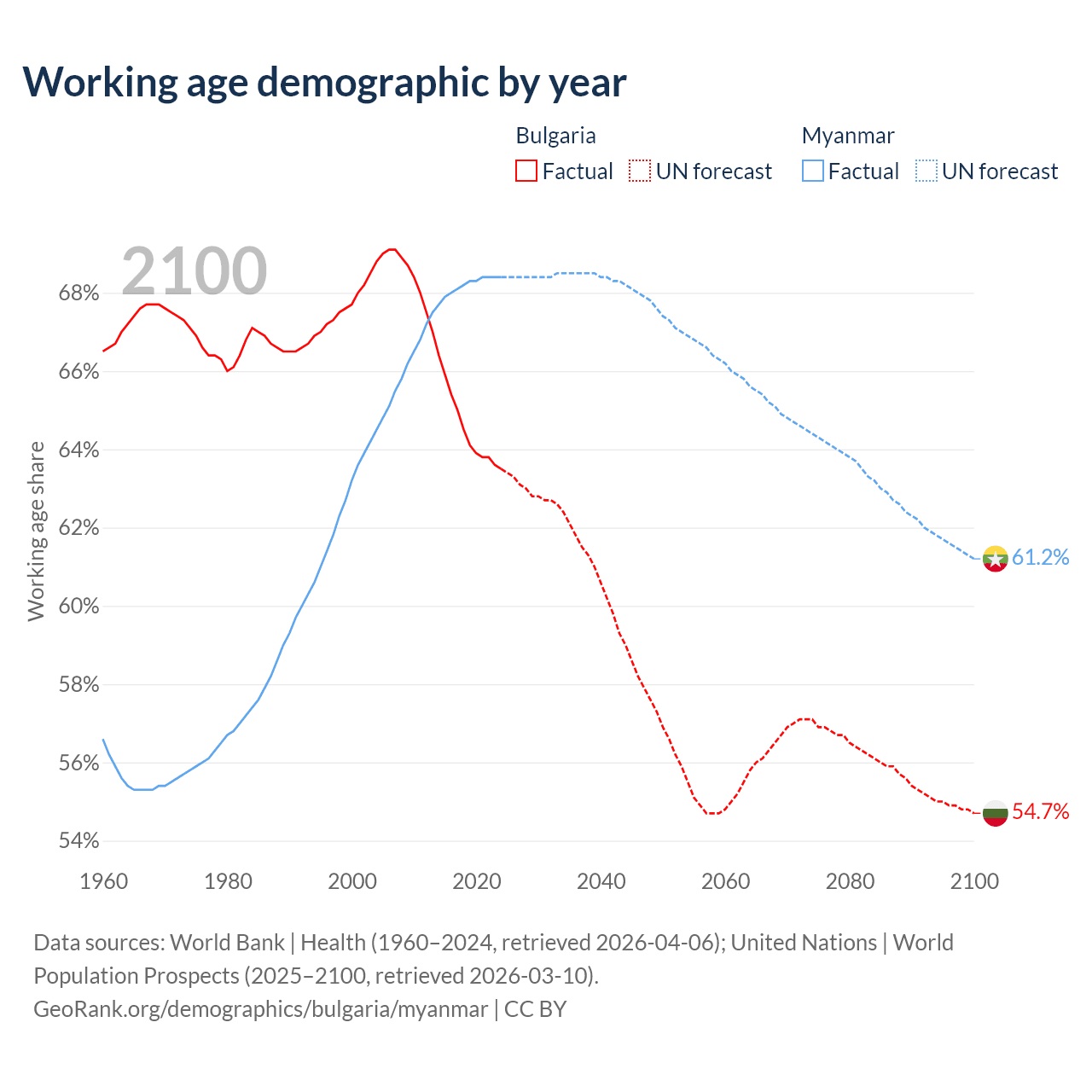 Median age Bulgaria vs Myanmar, 1960-2100