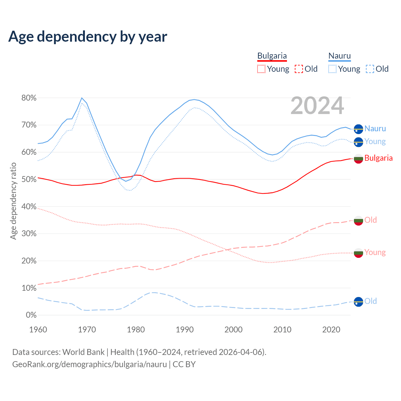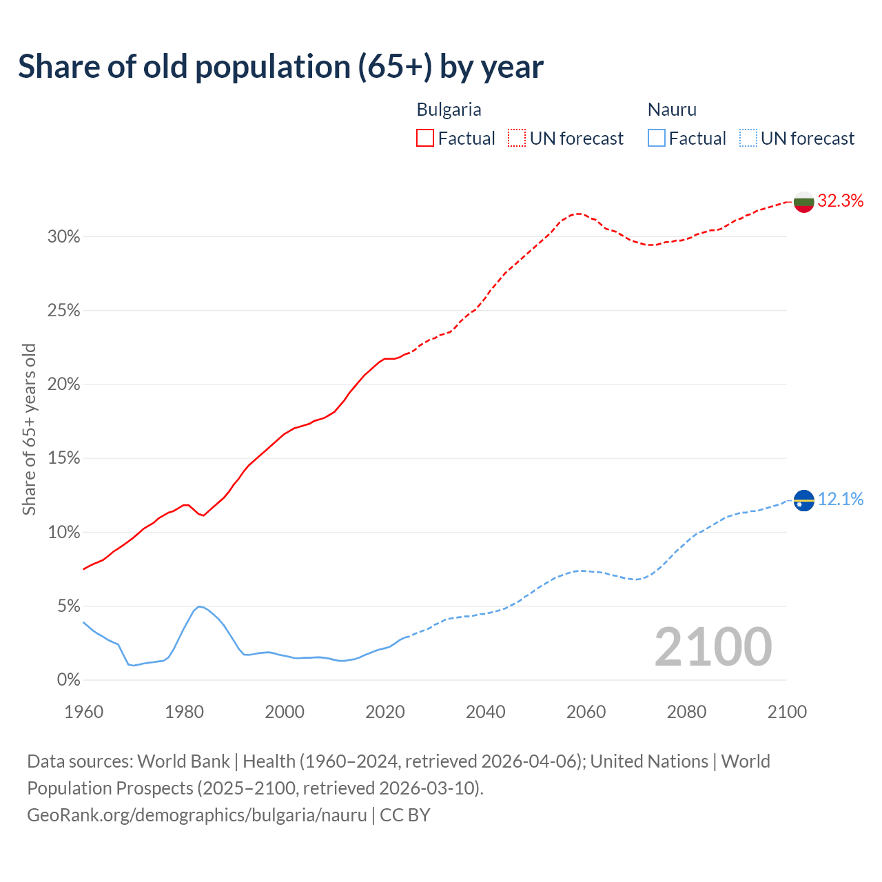 The share of older people aged 65 and over is 22% in Bulgaria and 2.85% in Nauru. Life expectancy in Bulgaria compared to Nauru .