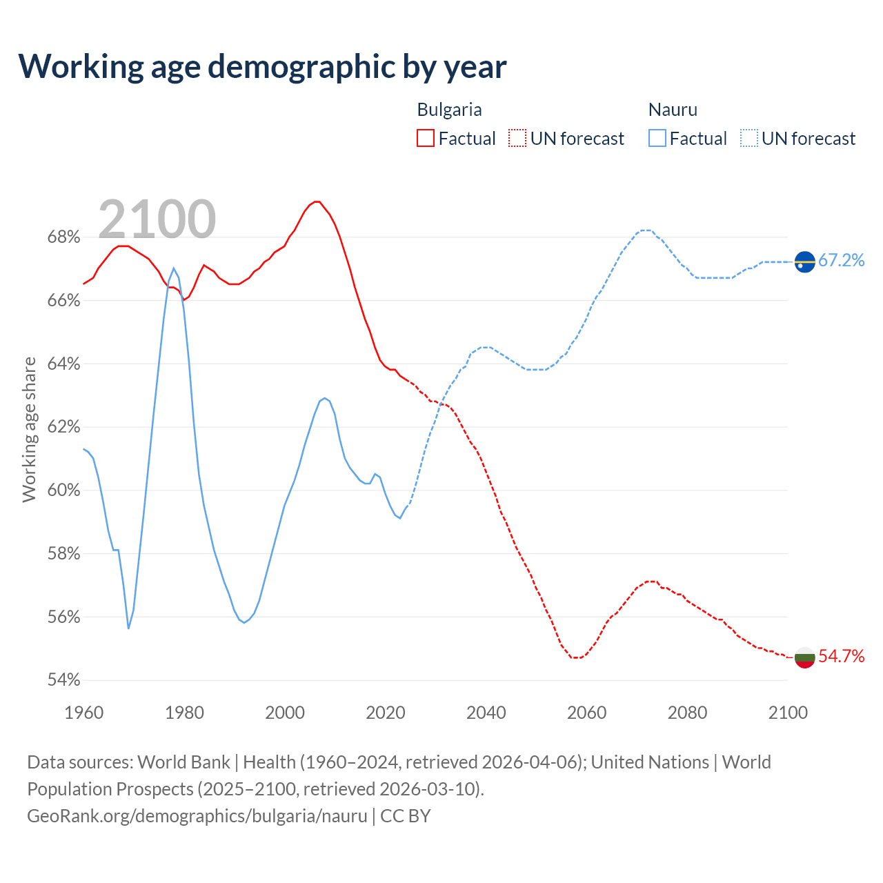 Median age Bulgaria vs Nauru, 1960-2100