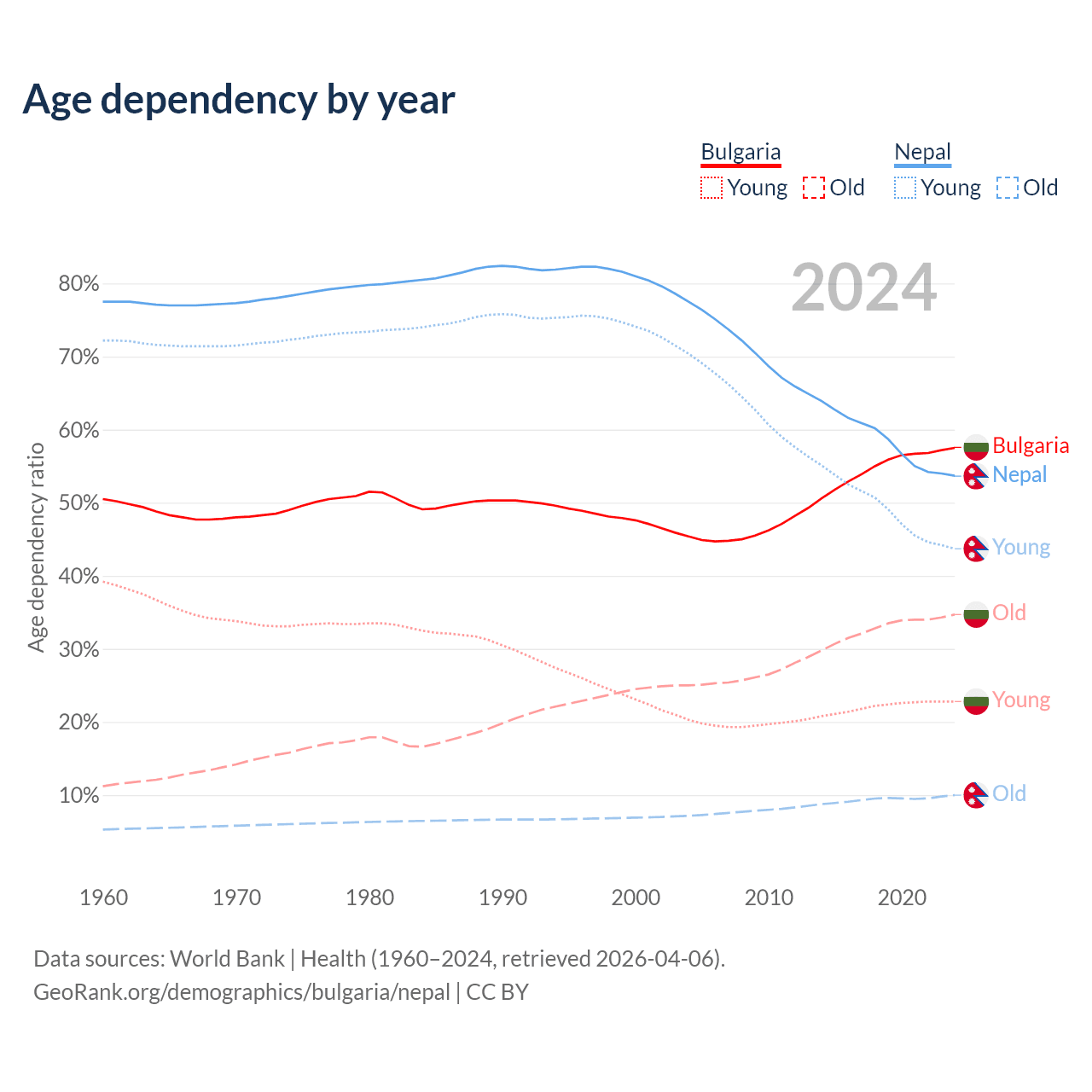 - The share of old-age demographic (65+) in Bulgaria is 22% vs 6.5% in Nepal.