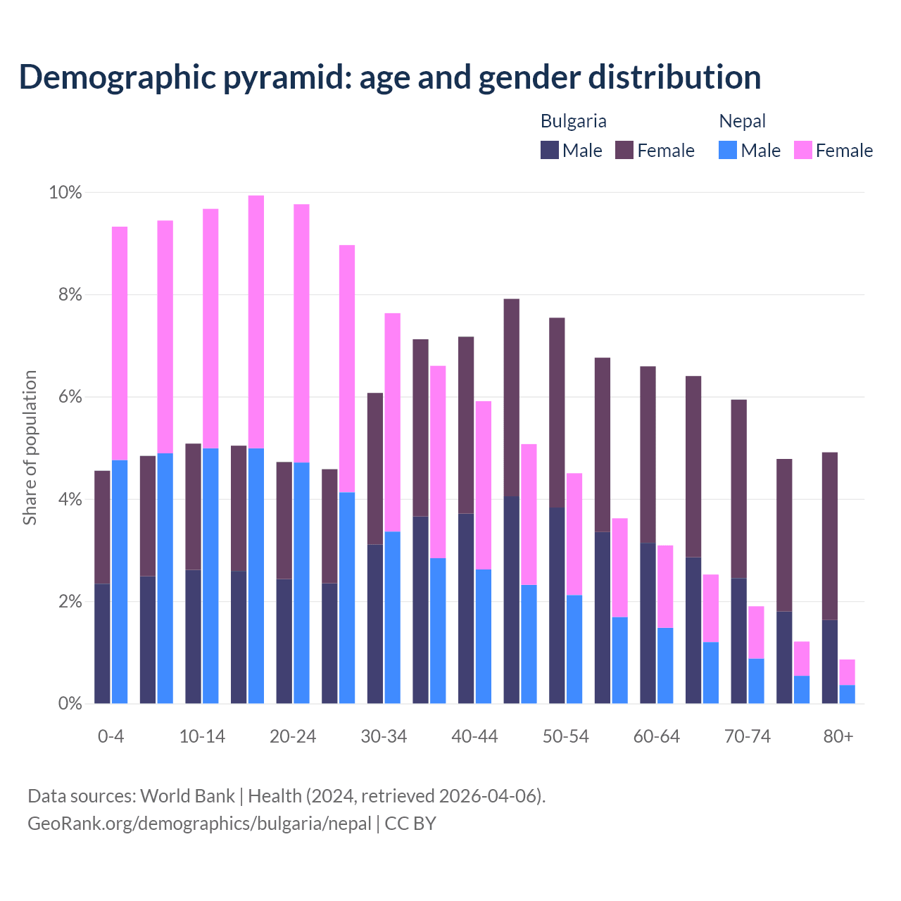 The share of older people aged 65 and over is 22% in Bulgaria and 6.5% in Nepal. Life expectancy in Bulgaria compared to Nepal .