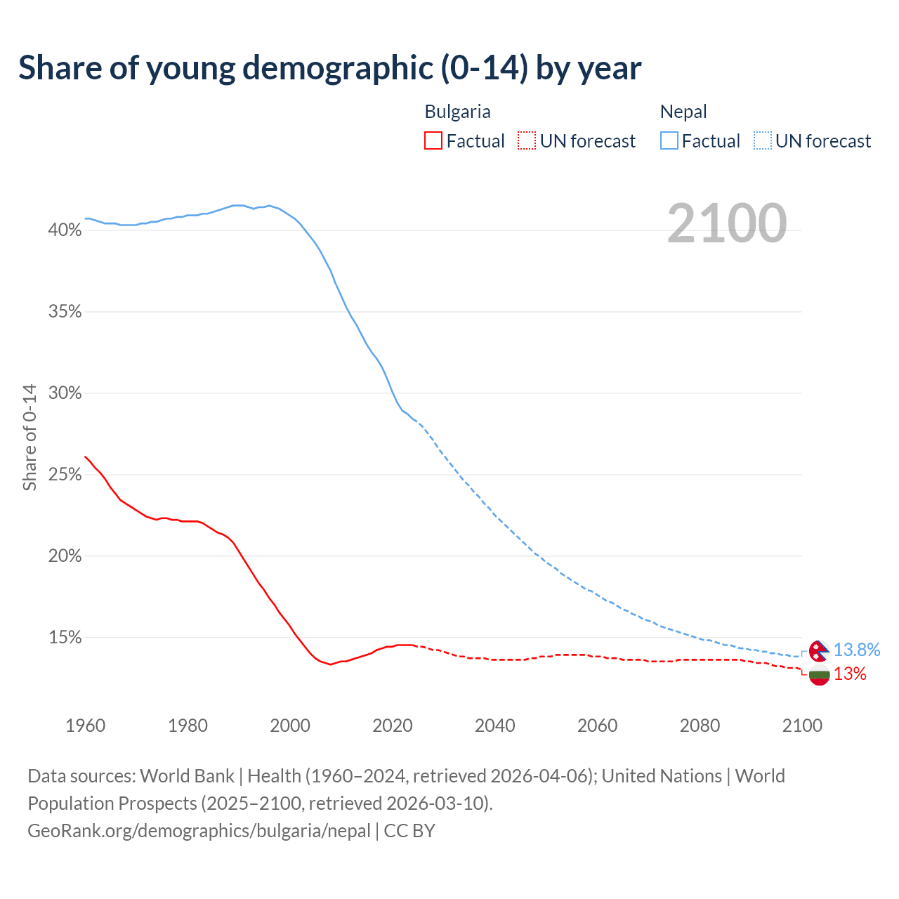 - The share of young demographic (0-15 years old) in Bulgaria is 14.5% vs 28.4% in Nepal.