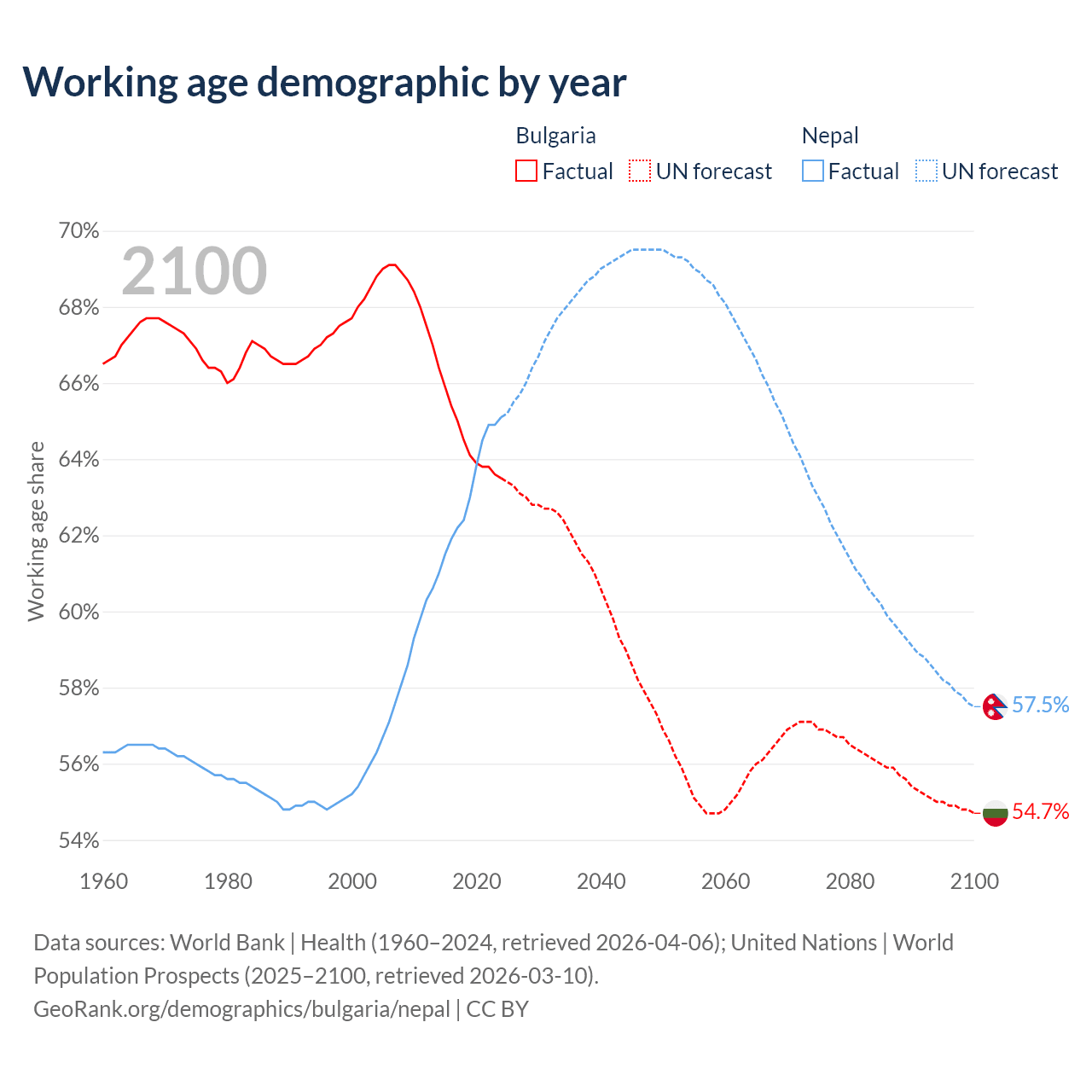 - Bulgaria has 4.04M working age adults (aged 15-64) vs 19.3M in Nepal.