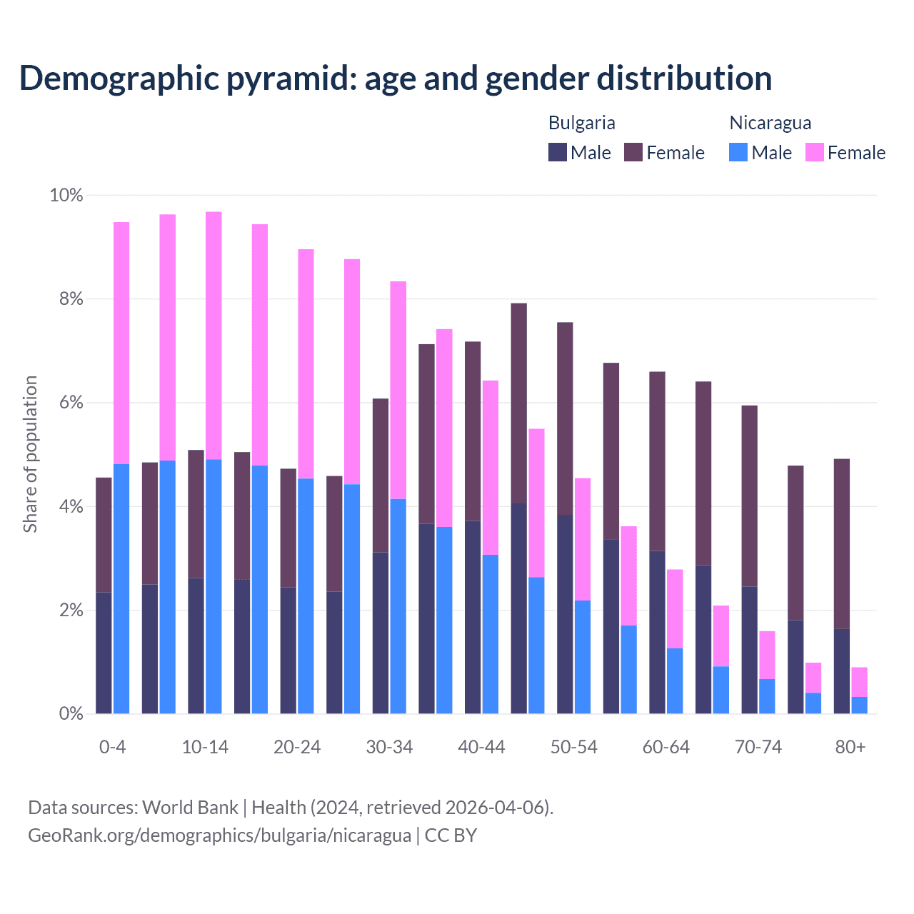 - Bulgaria is ranked 12/196 by median age (oldest to youngest) vs 125/196 for Nicaragua.
