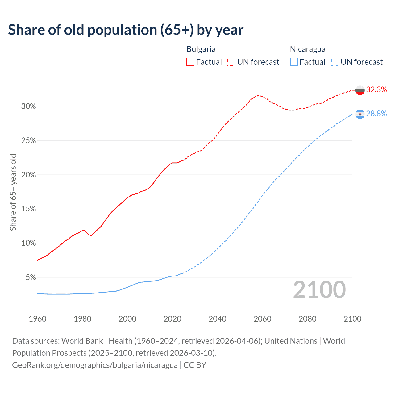The share of older people aged 65 and over is 22% in Bulgaria and 5.53% in Nicaragua. Life expectancy in Bulgaria compared to Nicaragua .