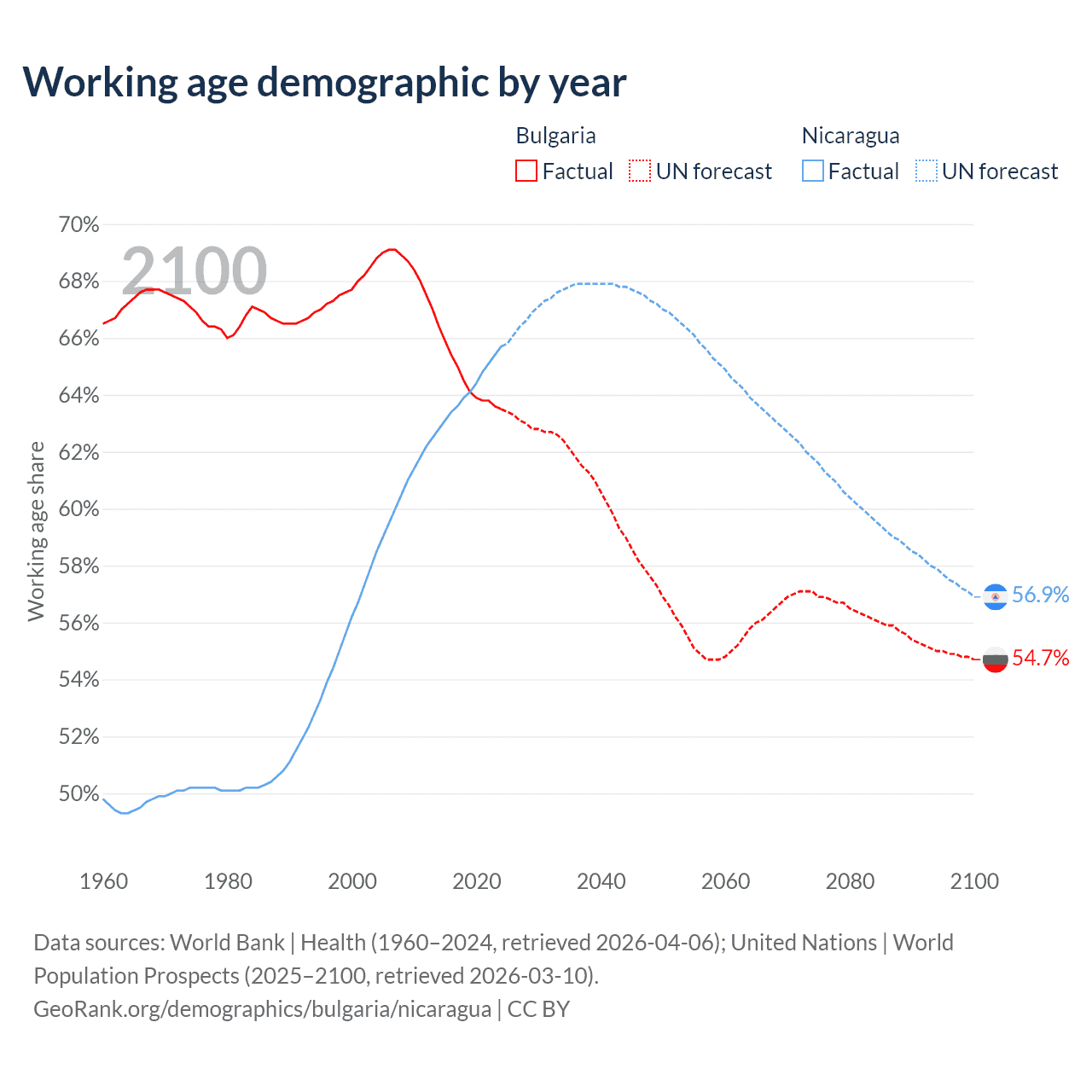 - Bulgaria has 4.04M working age adults (aged 15-64) vs 4.68M in Nicaragua.
