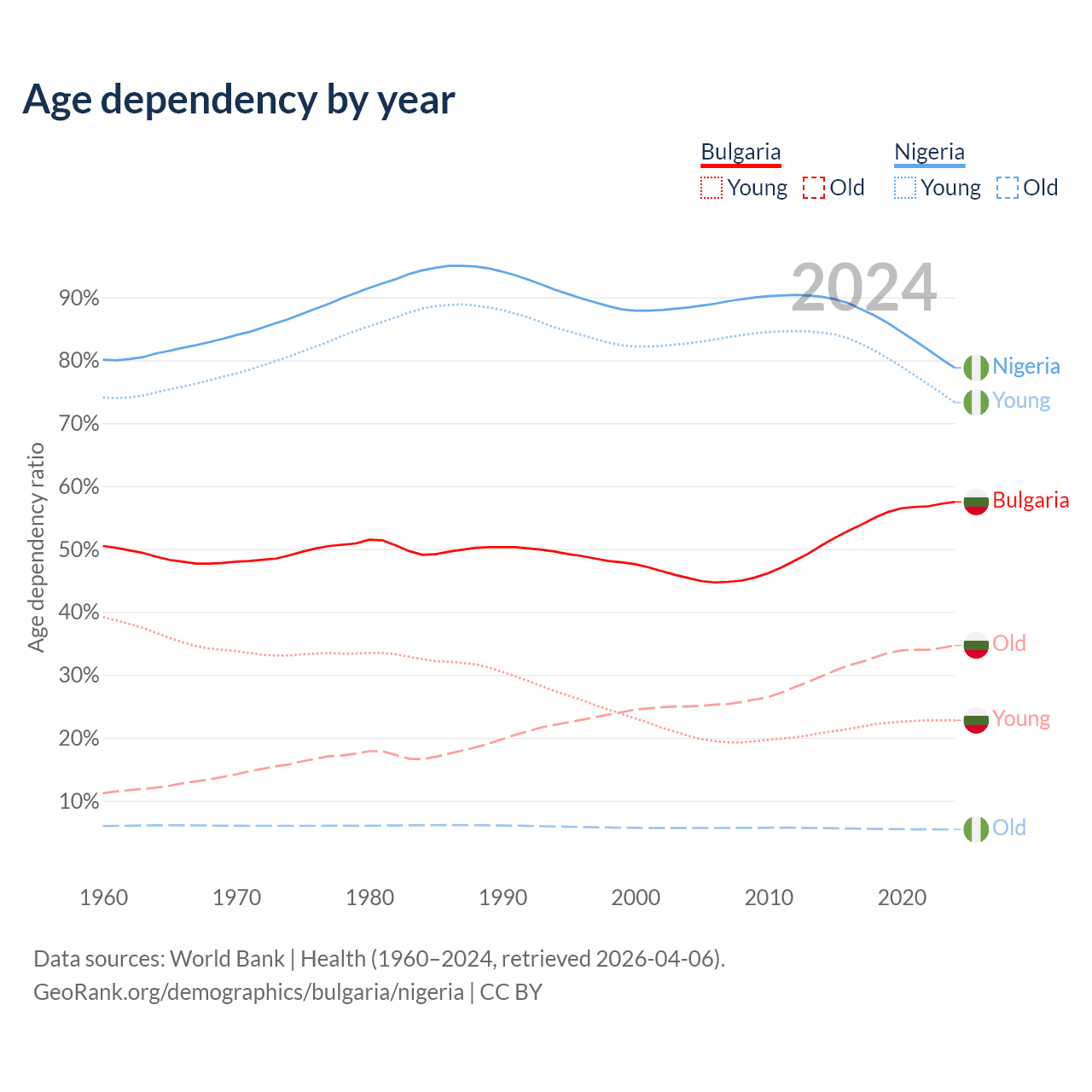 Data sources: World Bank | Health (1960–2024, retrieved 2026-04-06); U.S. Census Bureau (1960–2024, retrieved 2026-02-08).