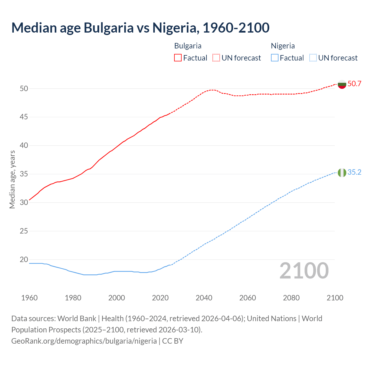 Median age Bulgaria vs Nigeria, 1960-2100