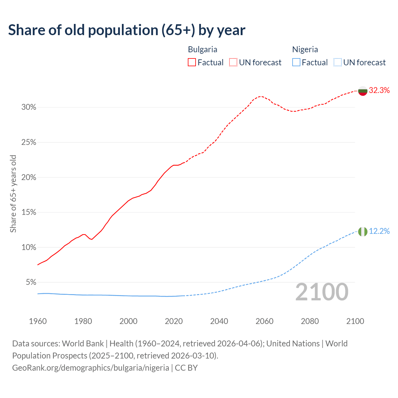 The share of older people aged 65 and over is 22% in Bulgaria and 3.05% in Nigeria. Life expectancy in Bulgaria compared to Nigeria .