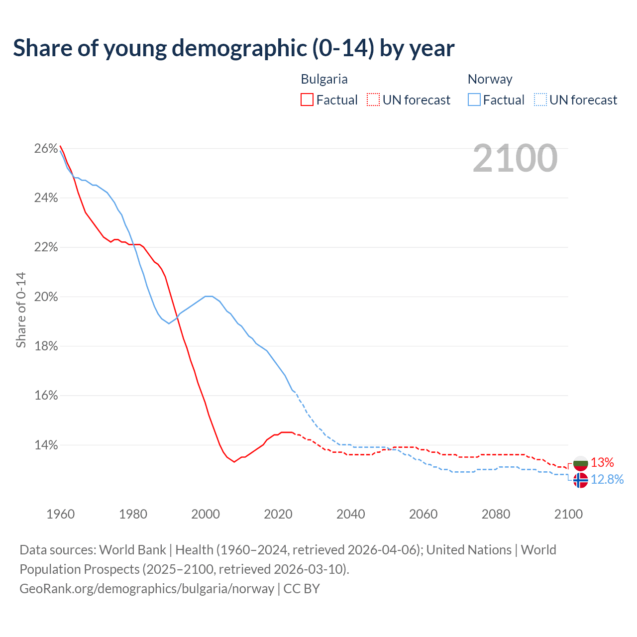 - The share of young demographic (0-15 years old) in Bulgaria is 14.5% vs 16.2% in Norway.