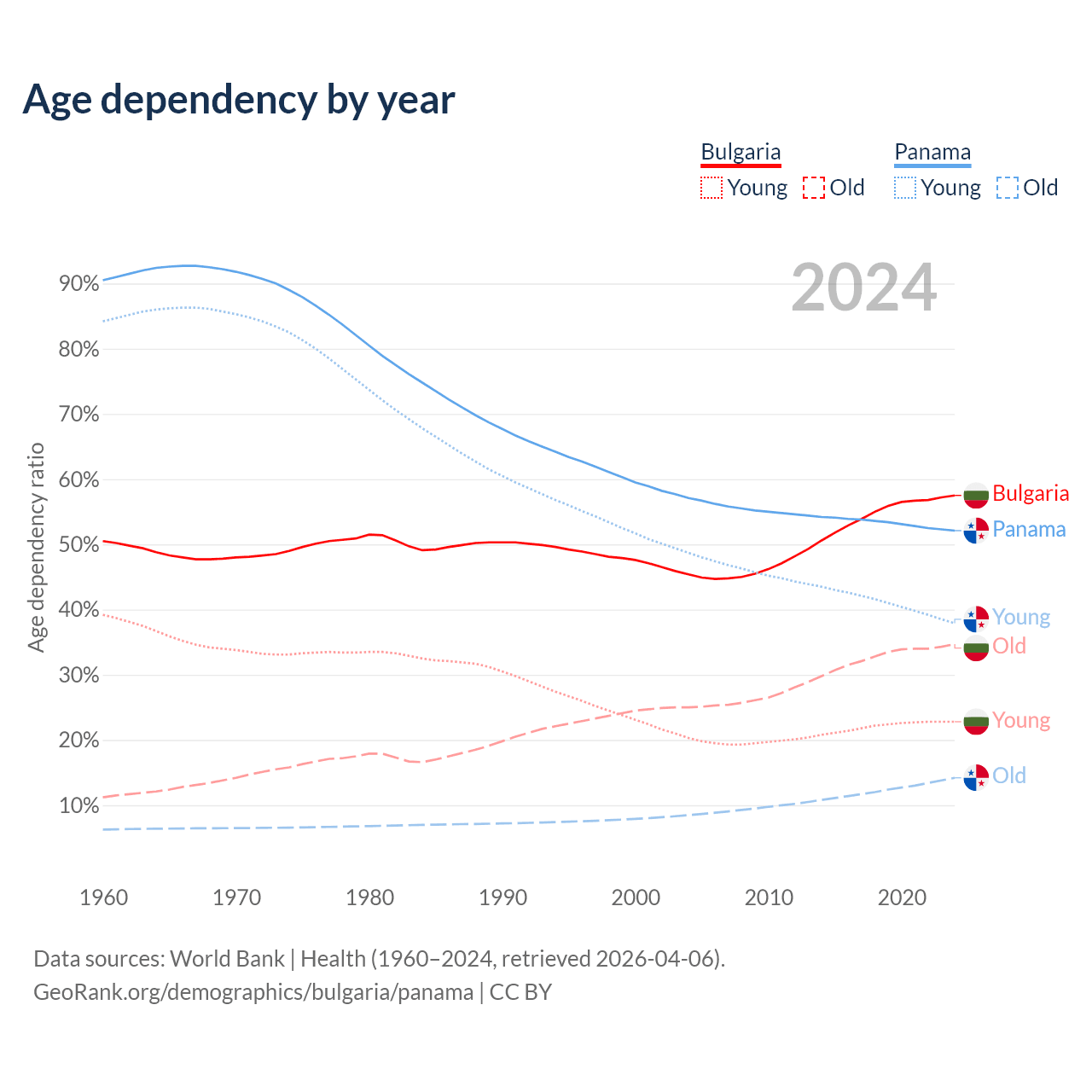 Data sources: World Bank | Health (1960–2024, retrieved 2026-04-06); U.S. Census Bureau (1960–2024, retrieved 2026-02-08).