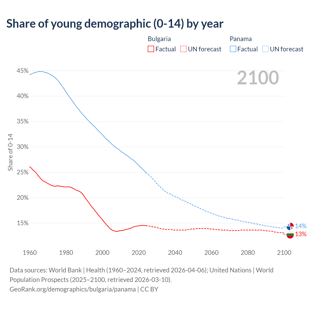- The share of young demographic (0-15 years old) in Bulgaria is 14.5% vs 24.9% in Panama.