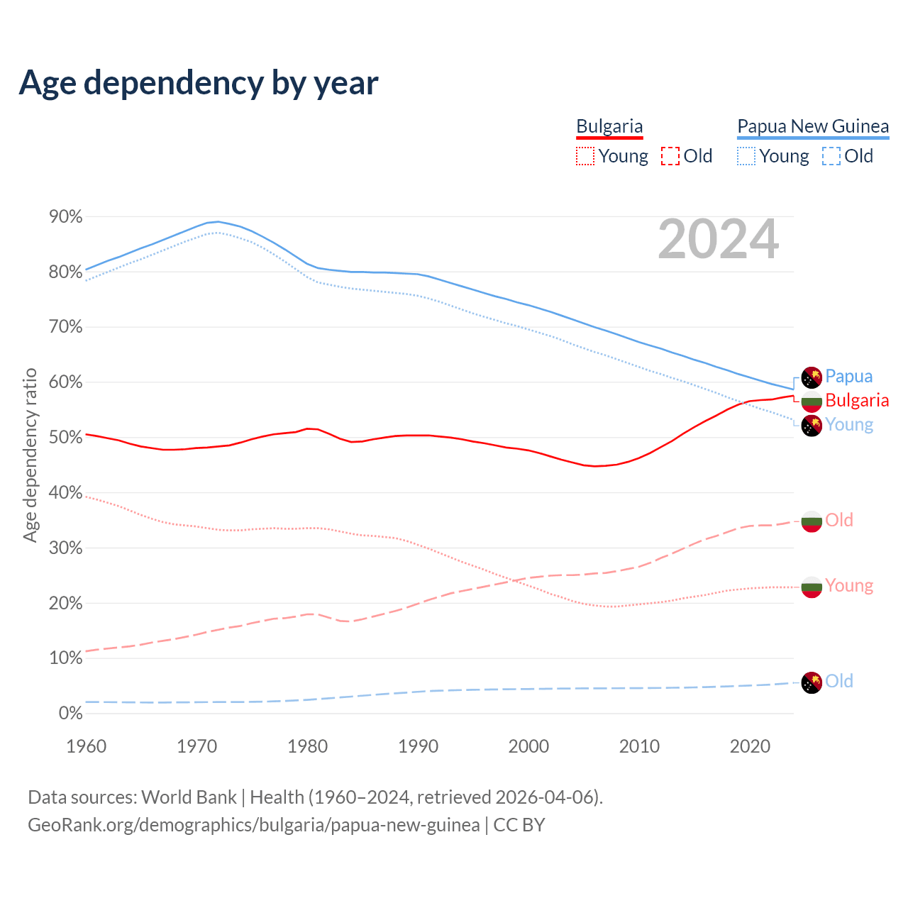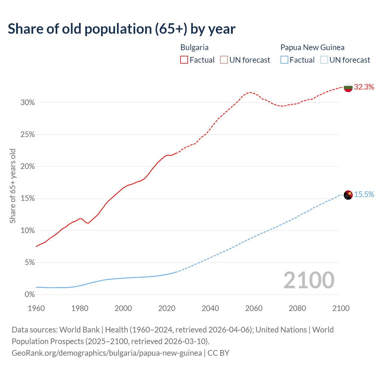 The share of older people aged 65 and over is 22% in Bulgaria and 3.46% in Papua New Guinea. Life expectancy in Bulgaria compared to Papua New Guinea .