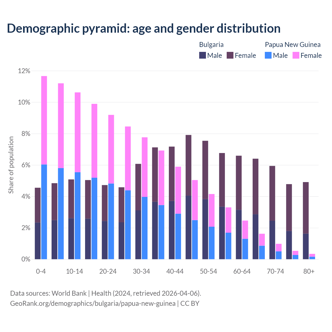 - As of 2026, the population of Bulgaria is 6.36M vs 11M in Papua New Guinea - 1.73 times difference.