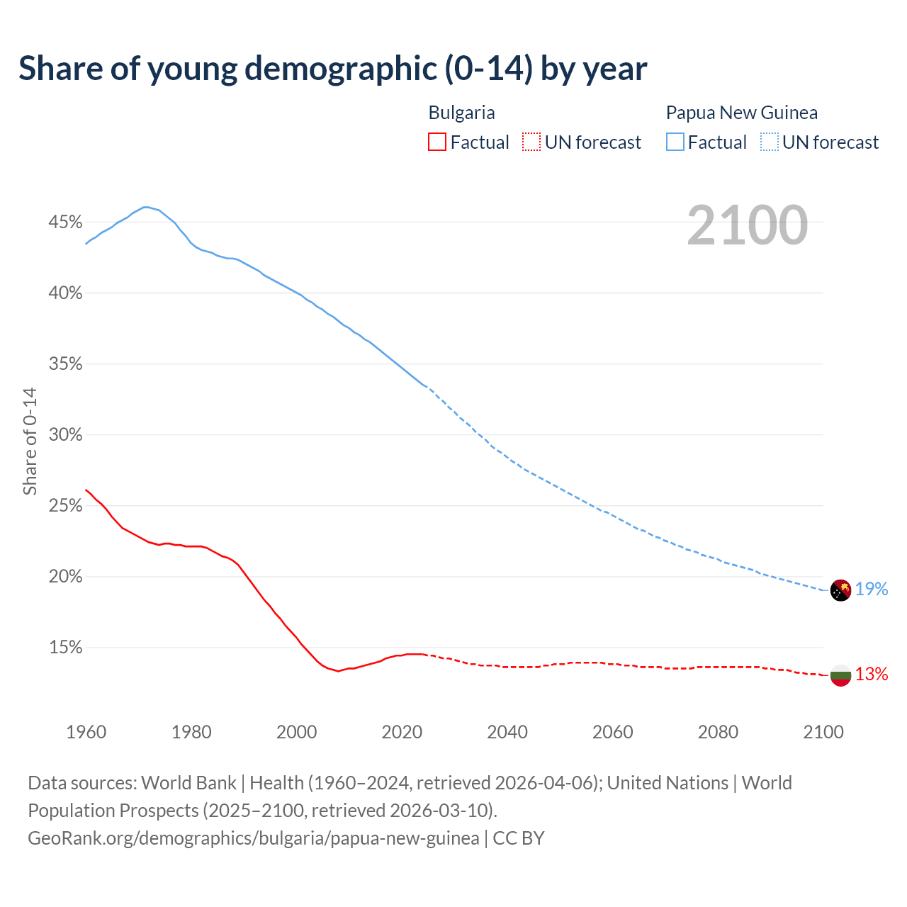 - The share of young demographic (0-15 years old) in Bulgaria is 14.5% vs 33.5% in Papua New Guinea.