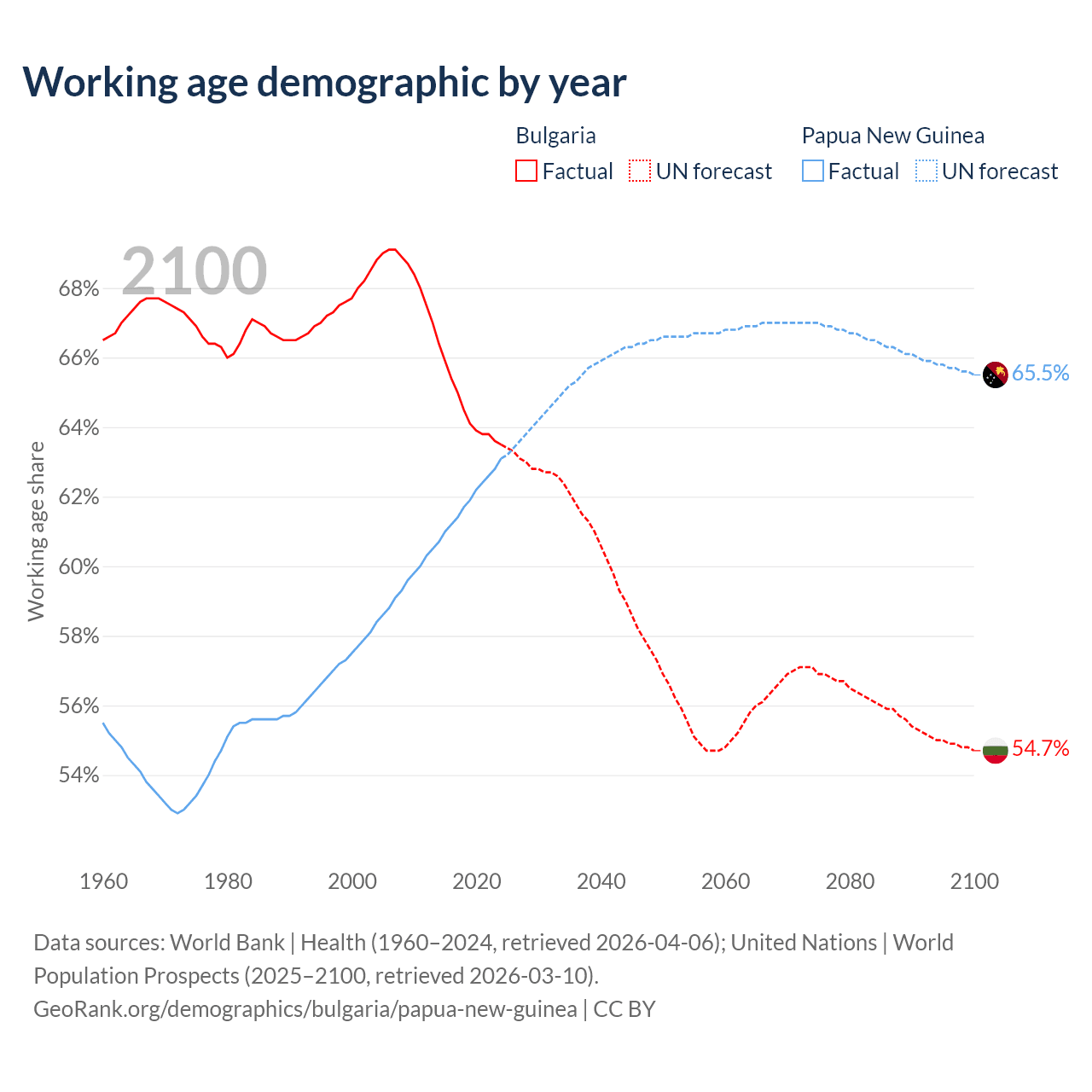 - Bulgaria has 4.04M working age adults (aged 15-64) vs 6.94M in Papua New Guinea.