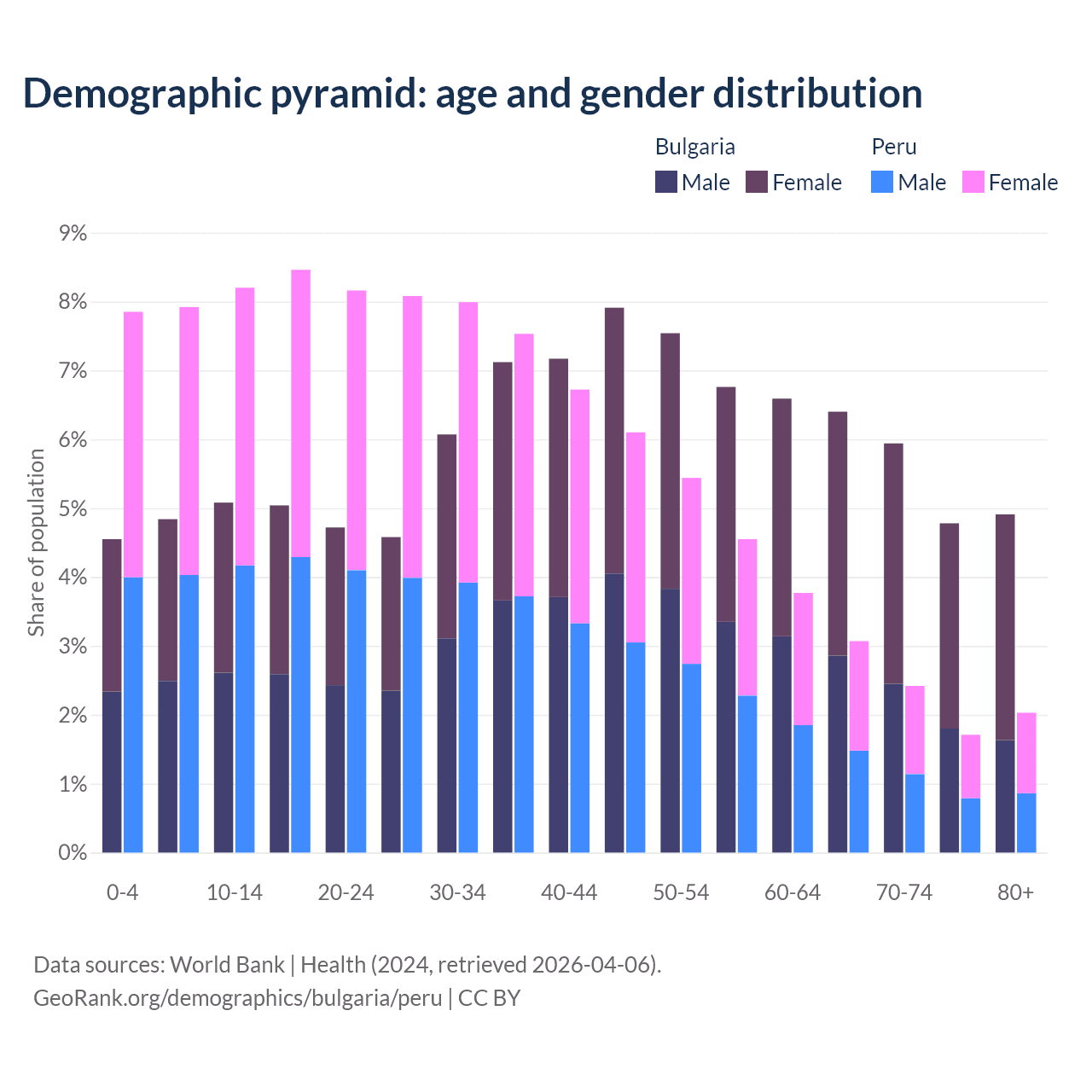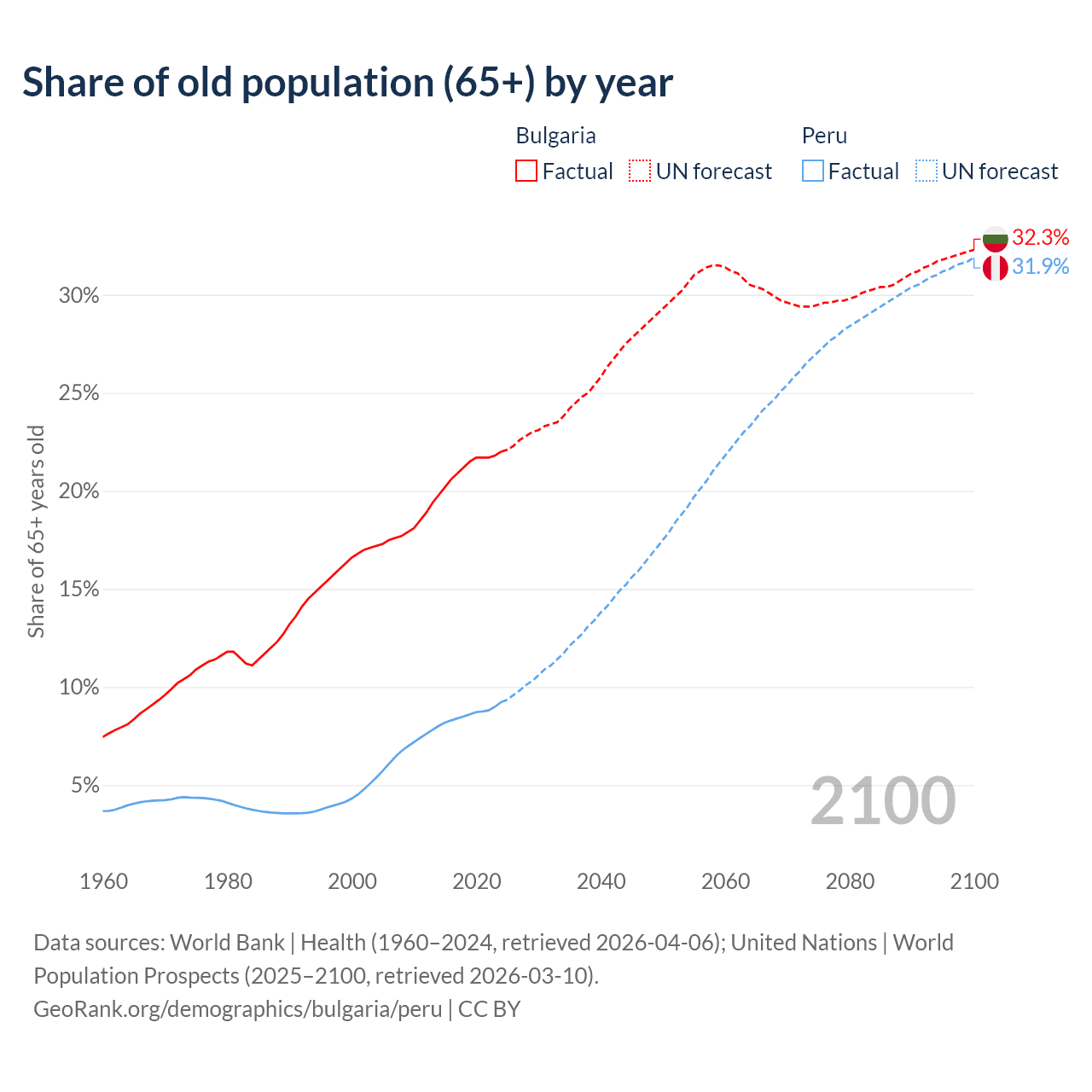 The share of older people aged 65 and over is 22% in Bulgaria and 9.23% in Peru. Life expectancy in Bulgaria compared to Peru .