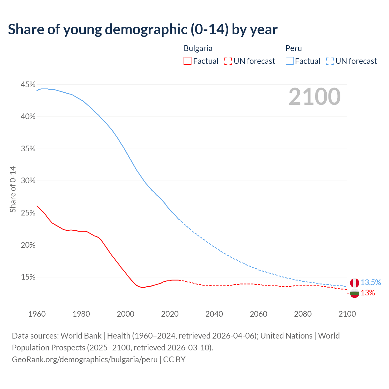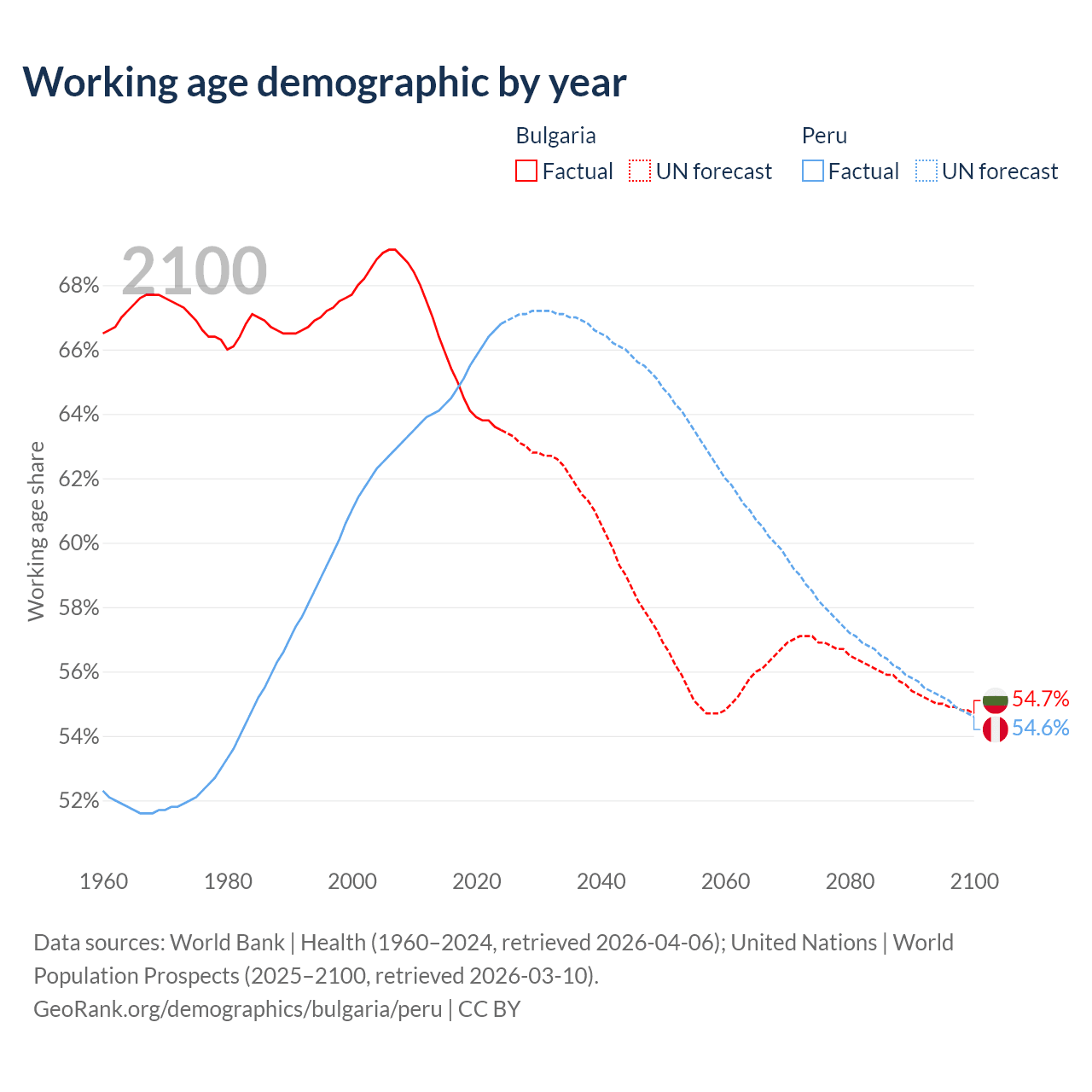 Median age Bulgaria vs Peru, 1960-2100